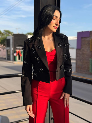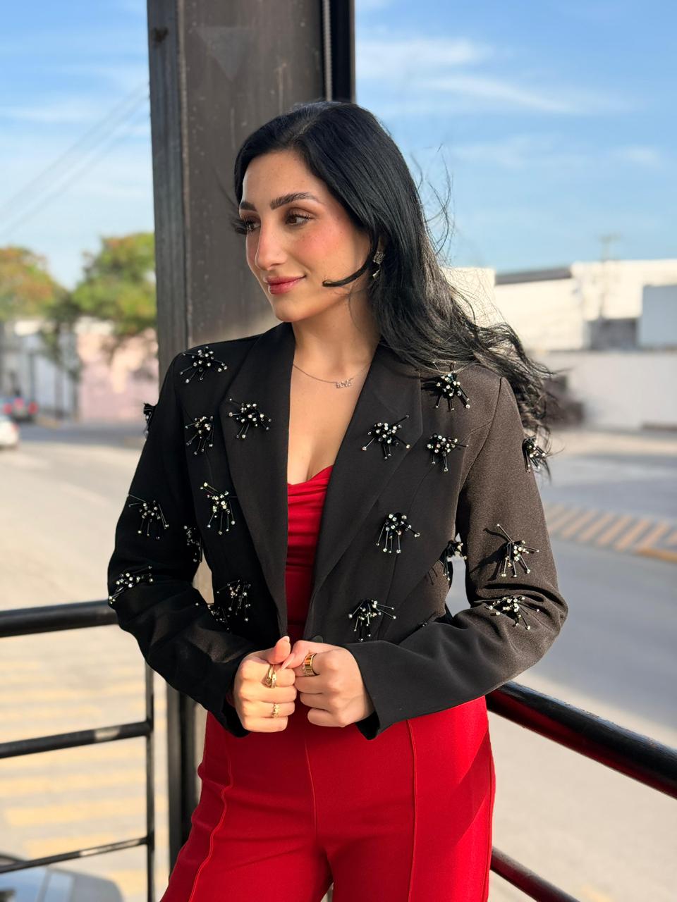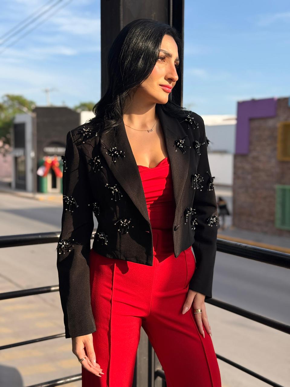 Luce increíble torero de color negro con unas aplicaciones de perdería en forma de pico que hará elevar tu look al máximo.