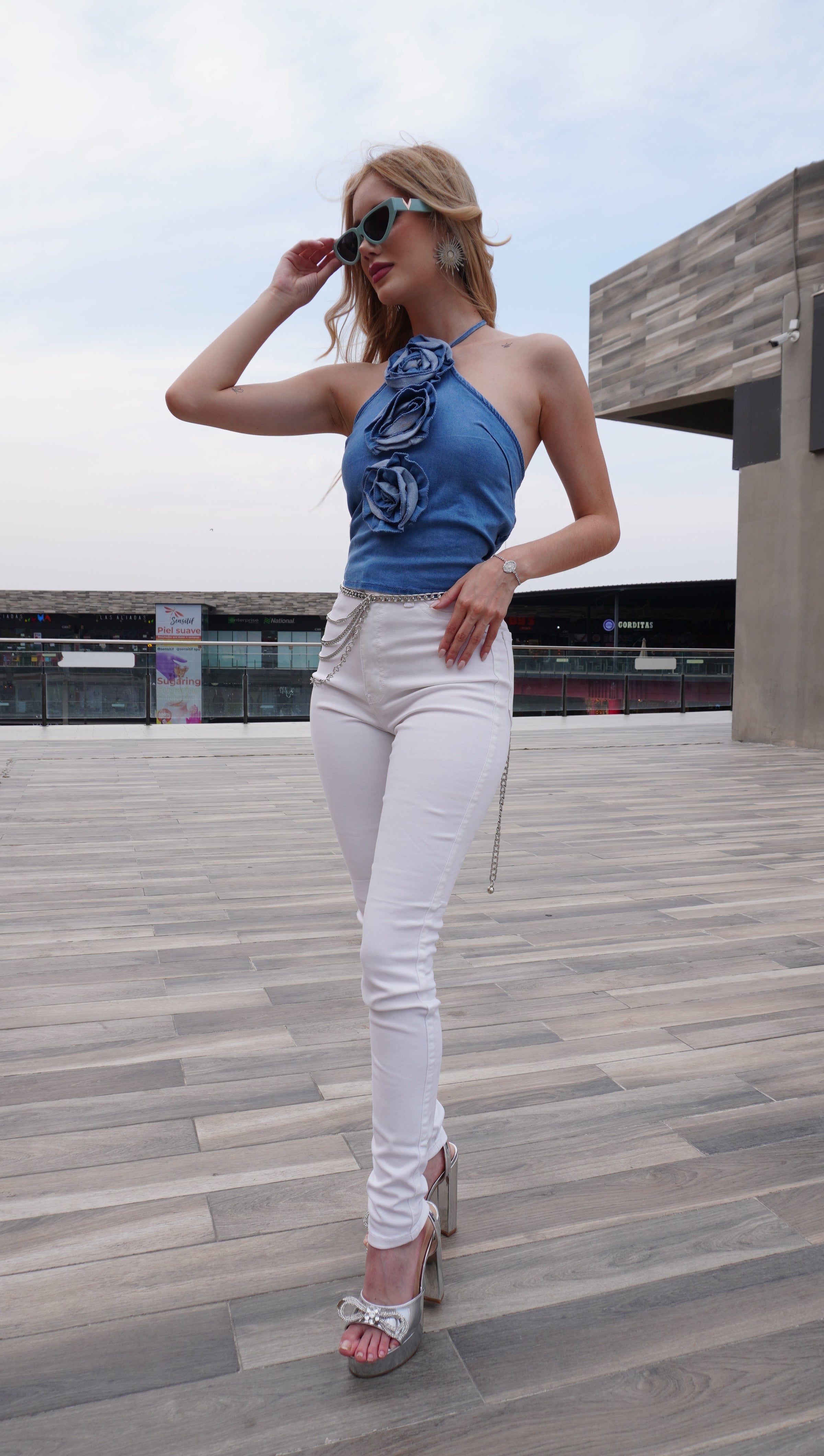 Top de mezclilla con delicados detalles florales, una fusión perfecta entre lo casual y lo femenino. Con un diseño cómodo y ligero, este top es ideal para los días cálidos o para dar un toque fresco a tu outfit. Perfecto para combinar con jeans o faldas, es una prenda versátil y llena de estilo.