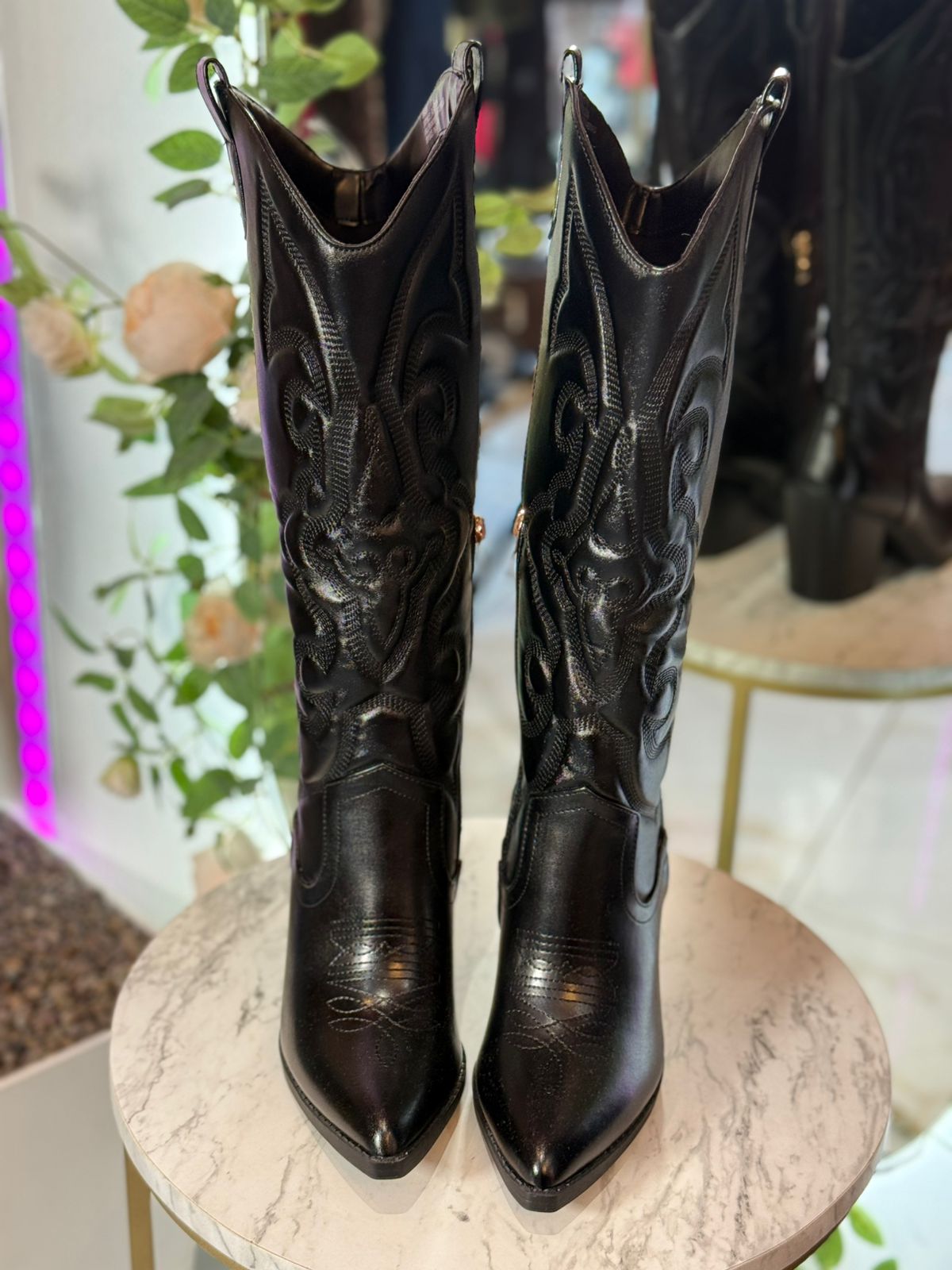 Eder modelo de bota vaquera clásica destaca por su imponente acabado negro satinado, que resalta un intrincado bordado artesanal en relieve a lo largo de todo el tubo, son pieza clave para elevar un look con mezclilla o añadir un contraste rebelde a un vestido vaporoso.