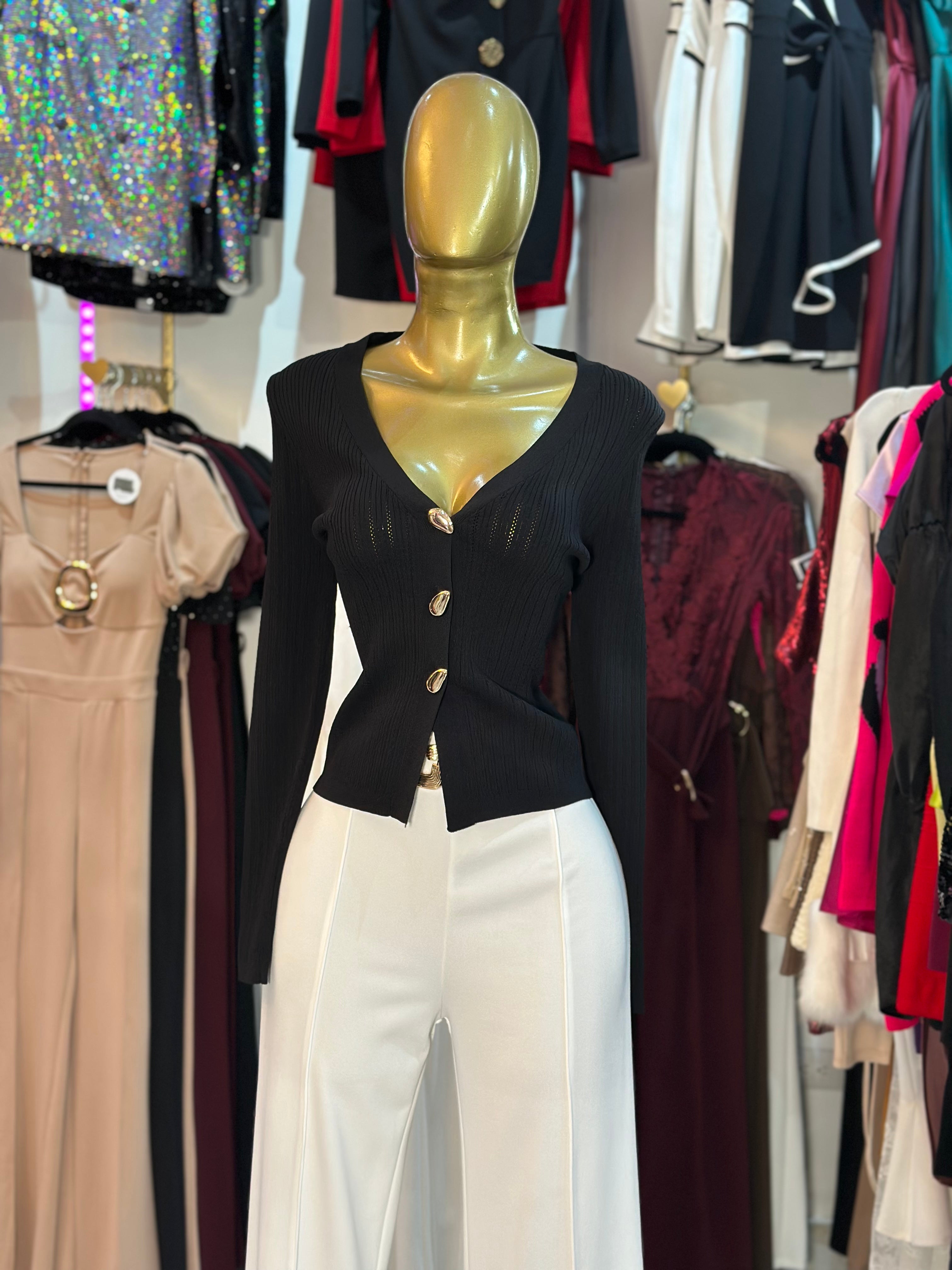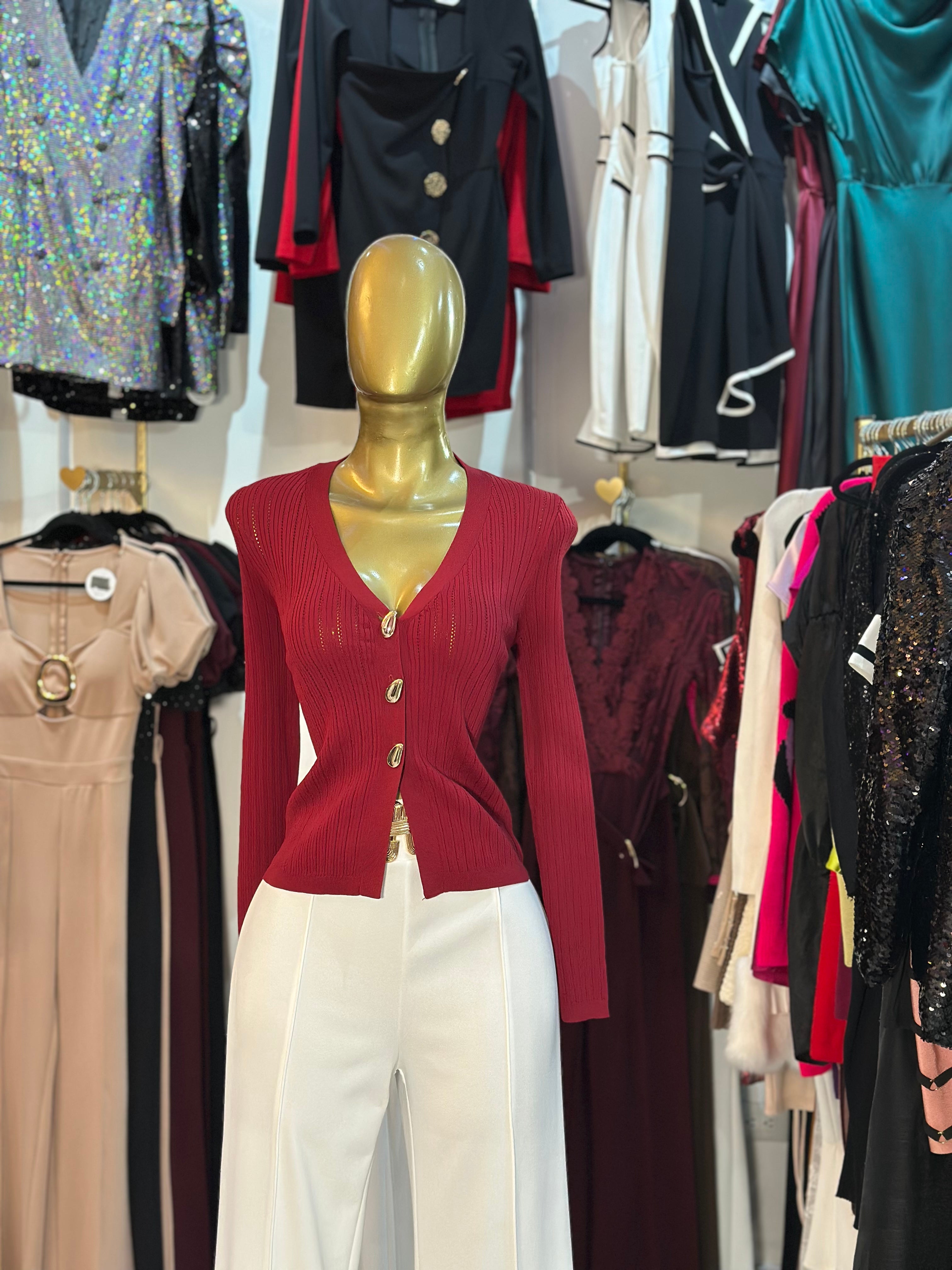 Dale un toque sofisticado a tus looks con nuestro suéter en tono guindo y negro, una combinación clásica y moderna a la vez. Su diseño de cuello V estiliza la silueta y realza el escote, mientras que los botones dorados en forma de gota aportan un detalle chic y femenino que lo hace único.