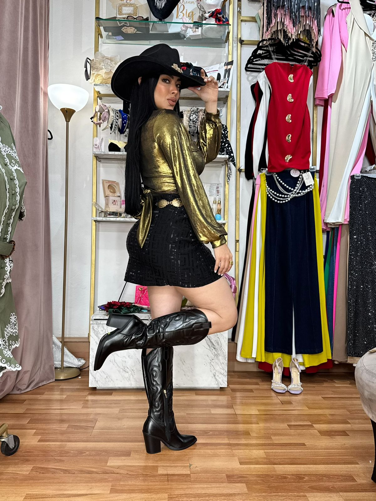 Blusa elegante de acabado metalizado que aporta brillo y sofisticación al look. Su diseño cruzado tipo wrap con escote en V realza el busto y estiliza la figura, mientras que las mangas largas ligeramente abullonadas añaden un toque femenino y moderno. Ideal para looks de noche o outfits con carácter.