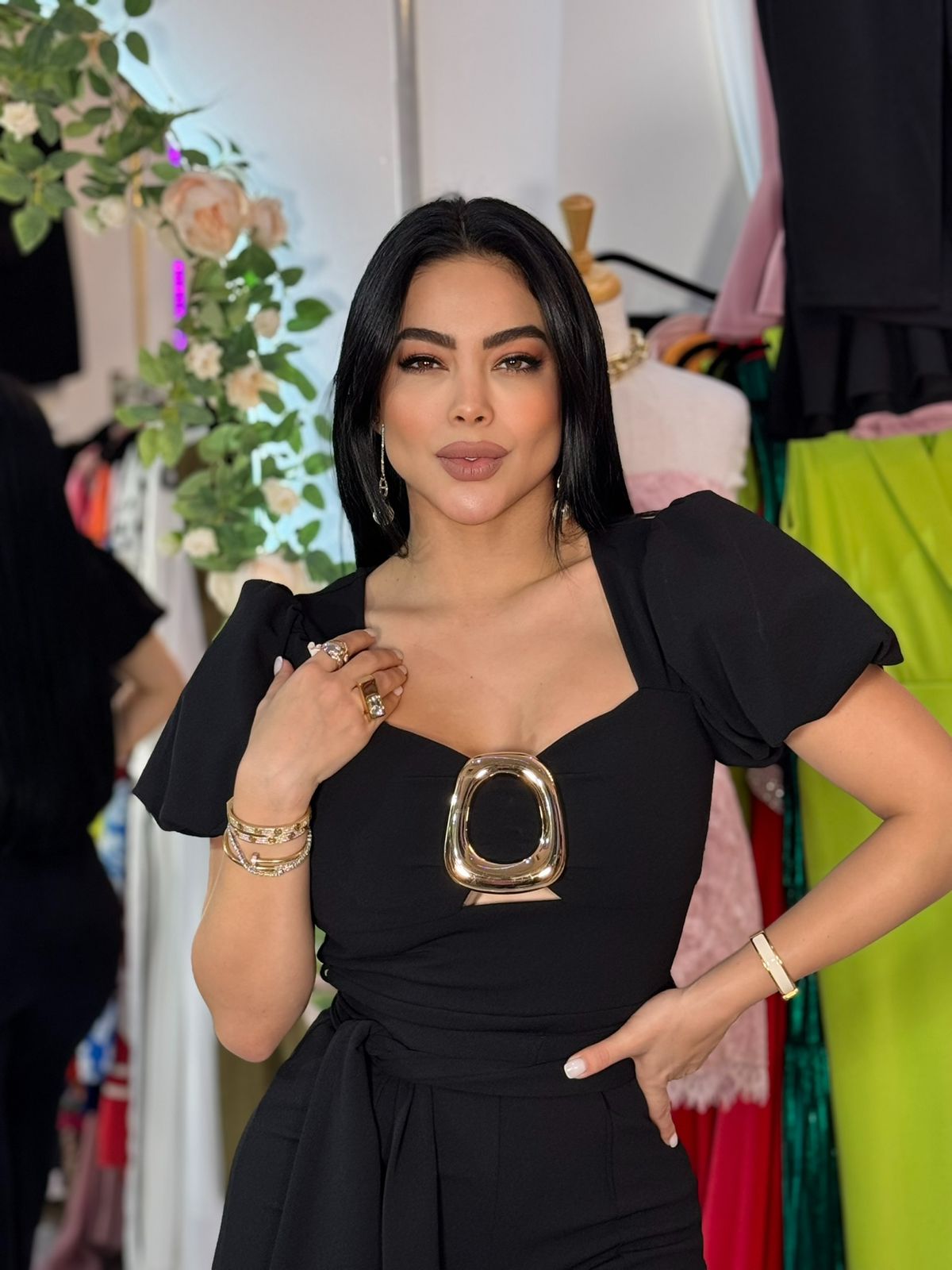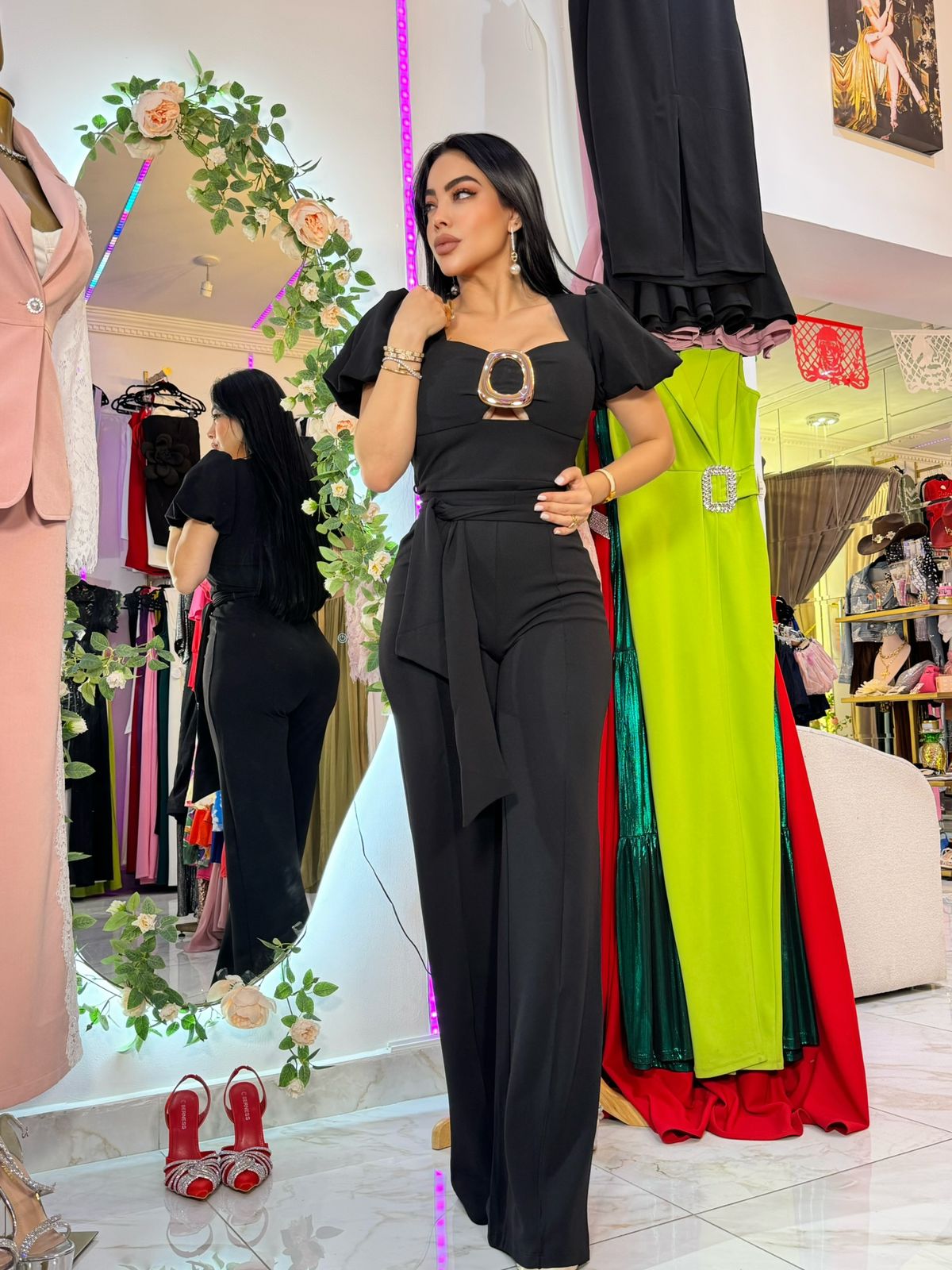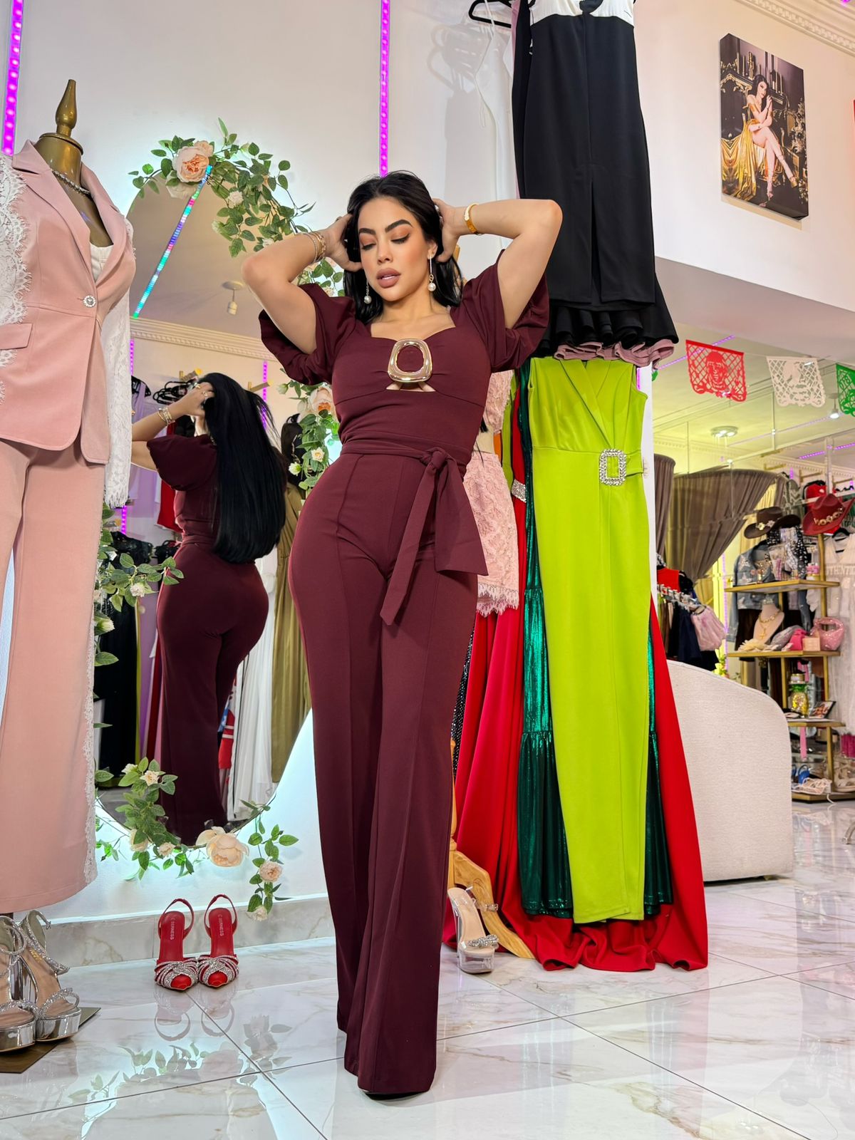 Jumpsuit sofisticado de corte ajustado que estiliza la figura. Diseñado con mangas abullonadas, escote estructurado y detalle metálico central que aporta un toque moderno y elegante. El pantalón de caída recta alarga visualmente la silueta, brindando comodidad y estilo en una sola pieza.