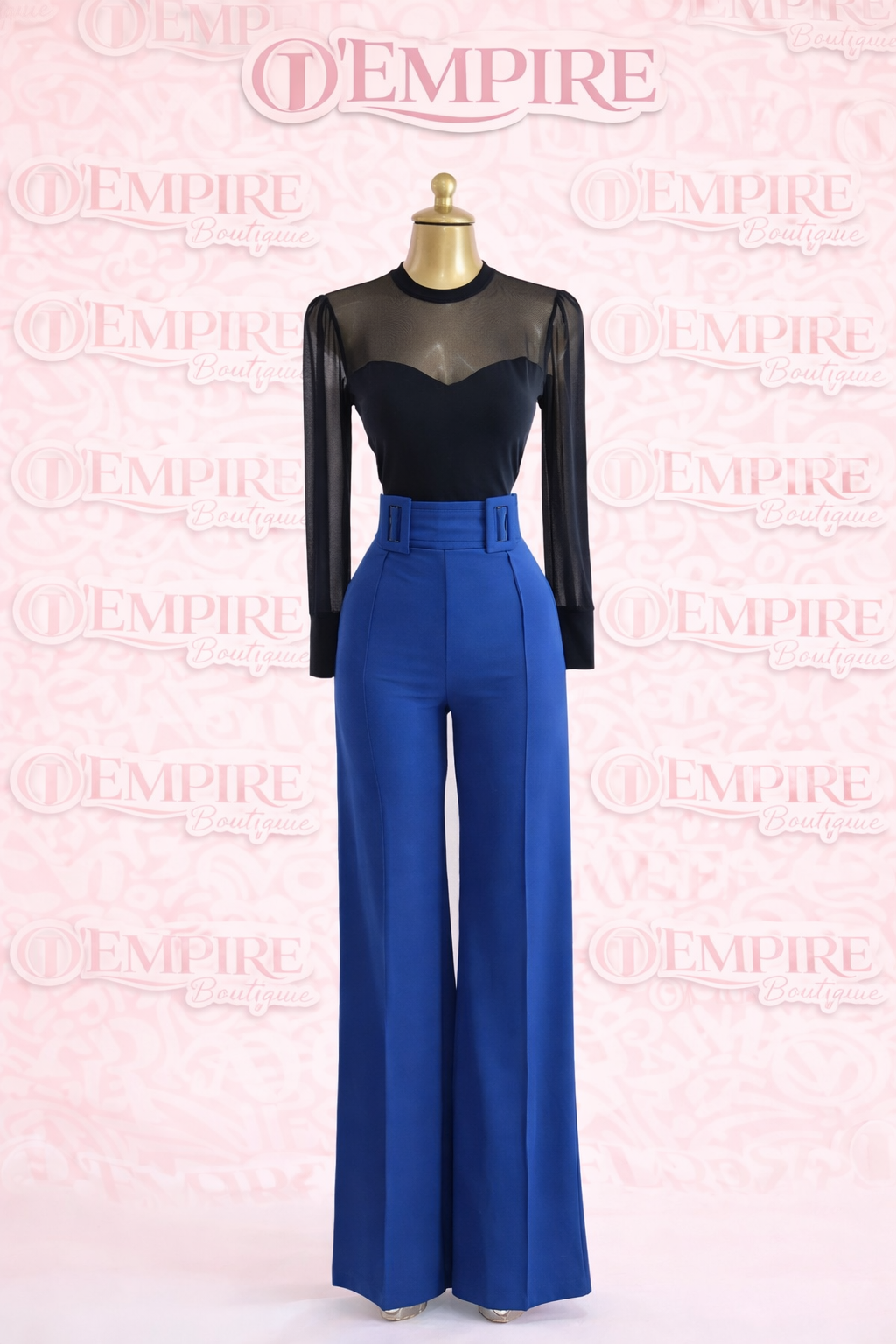 Palazzo elegante de tiro alto diseñado para estilizar la silueta y alargar visualmente las piernas gracias a su corte amplio y caída fluida. Su cintura estructurada incorpora delicados detalles decorativos que aportan un toque moderno y sofisticado, realzando la figura con un acabado limpio y refinado.