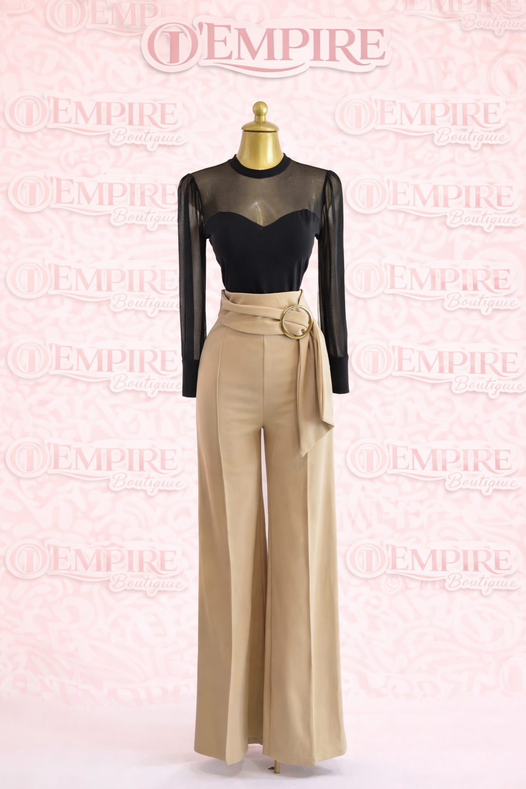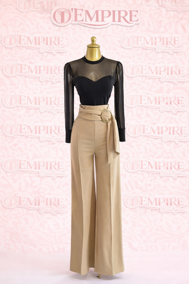 Palazzo elegante de tiro alto diseñado para estilizar la silueta y alargar visualmente las piernas gracias a su corte amplio y caída fluida. Su cintura alta incorpora un cinturón envolvente con aro metálico que define la figura y aporta un toque sofisticado, moderno y femenino.