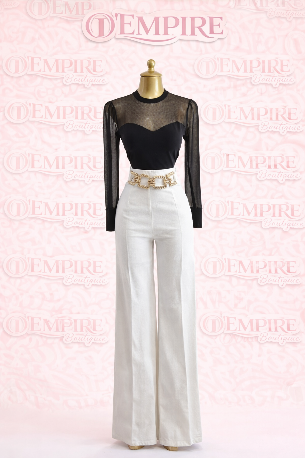 Palazzo de estilo sofisticado diseñado para realzar la silueta gracias a su tiro alto y corte amplio que alarga visualmente las piernas. Su cintura estructurada se complementa con un cinturón decorativo de cadena dorada que aporta un toque moderno, elegante y llamativo.