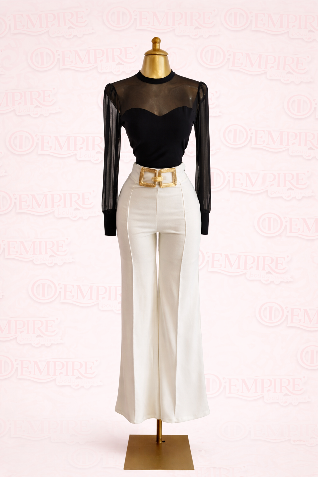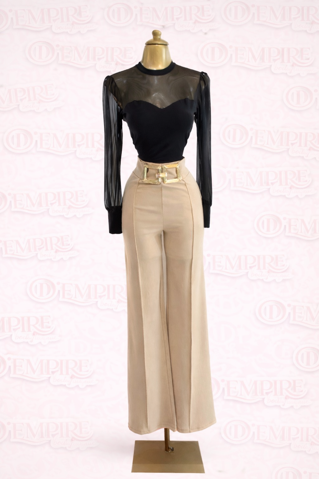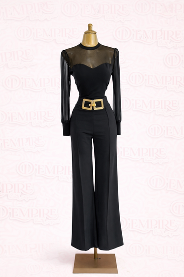 Palazzo elegante de tiro alto diseñado para estilizar la silueta con una caída amplia y fluida que alarga visualmente las piernas. La cintura marcada incorpora un cinturón decorativo dorado que aporta un toque sofisticado y moderno, ideal para looks formales o de noche.