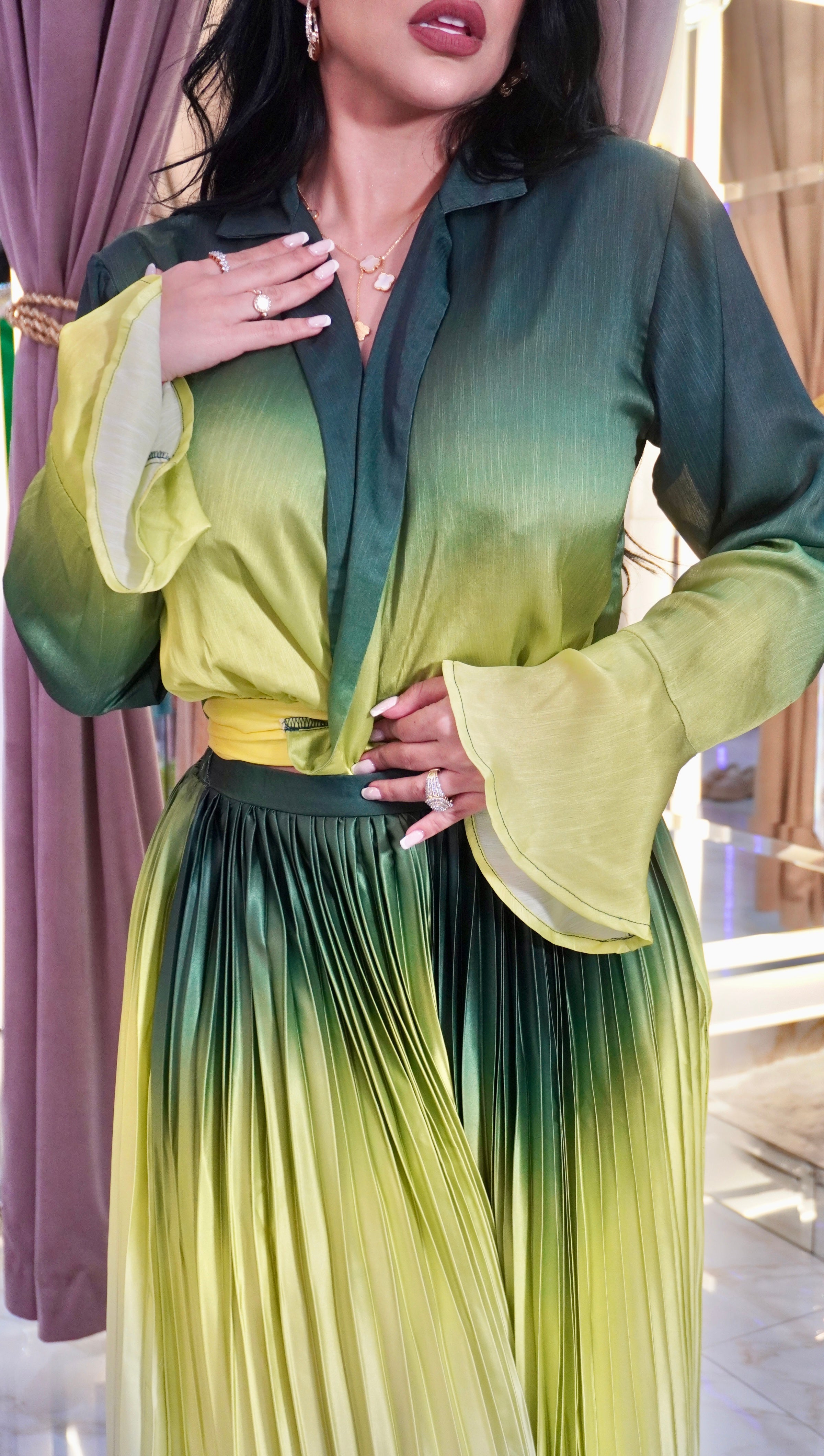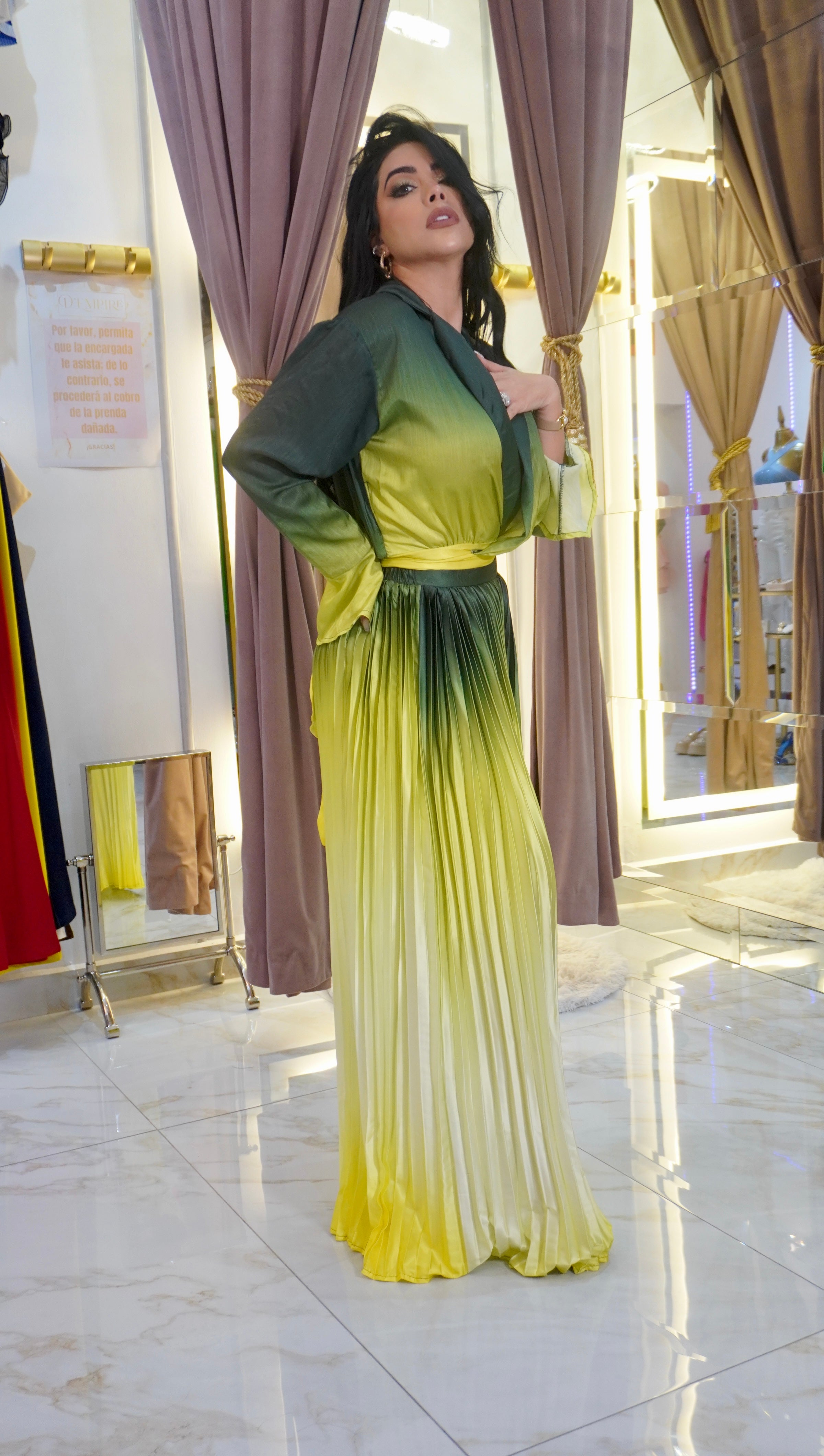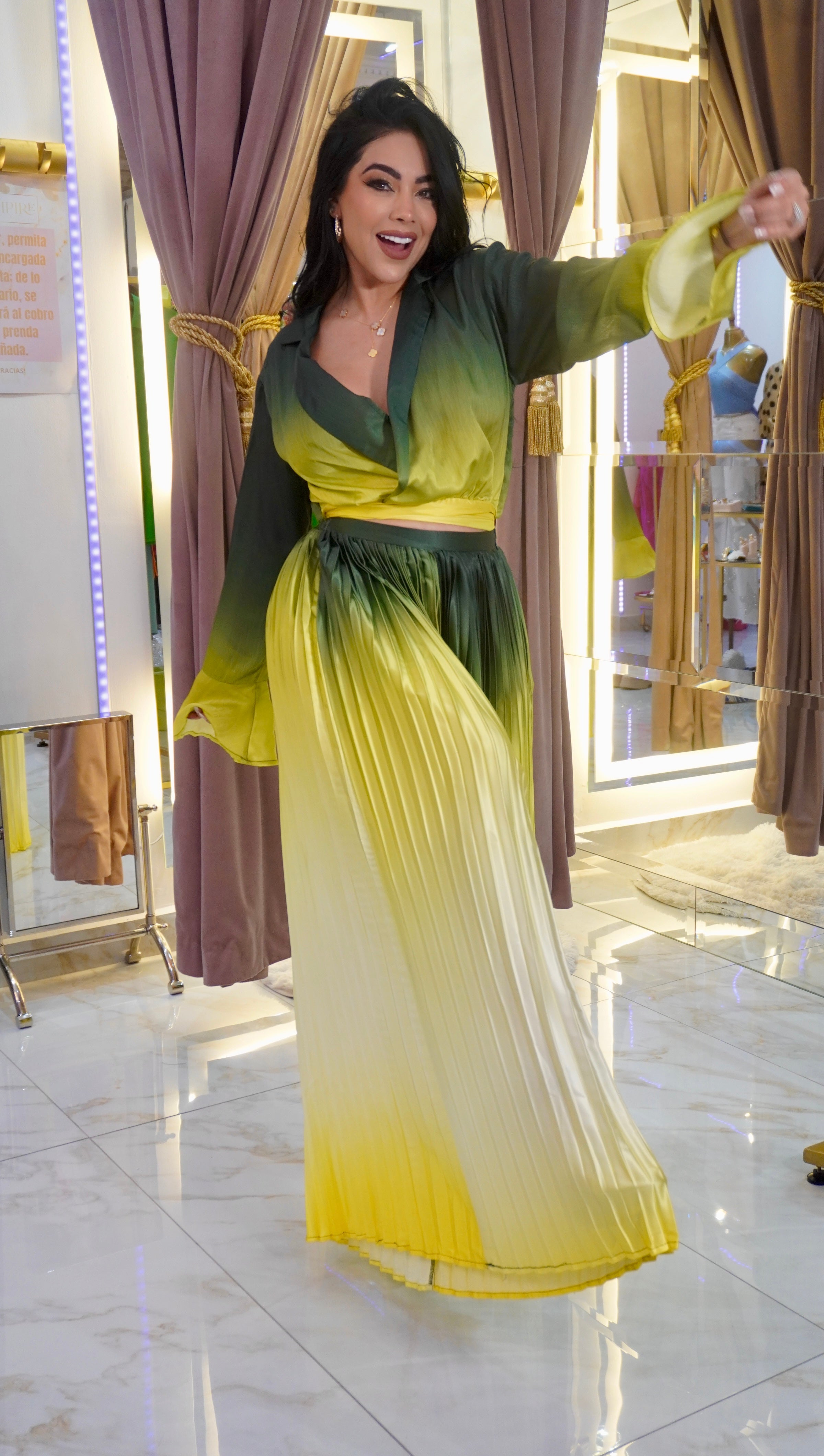 Set de lujo en tono verde, confeccionado en suave seda que ofrece una caída fluida y elegante. Incluye una blusa o top a juego y pantalones de corte sofisticado, perfectos para un look de noche o una ocasión especial. Su textura ligera y brillante le da un toque de frescura y glamour. Ideal para combinar con tacones y accesorios delicados.
