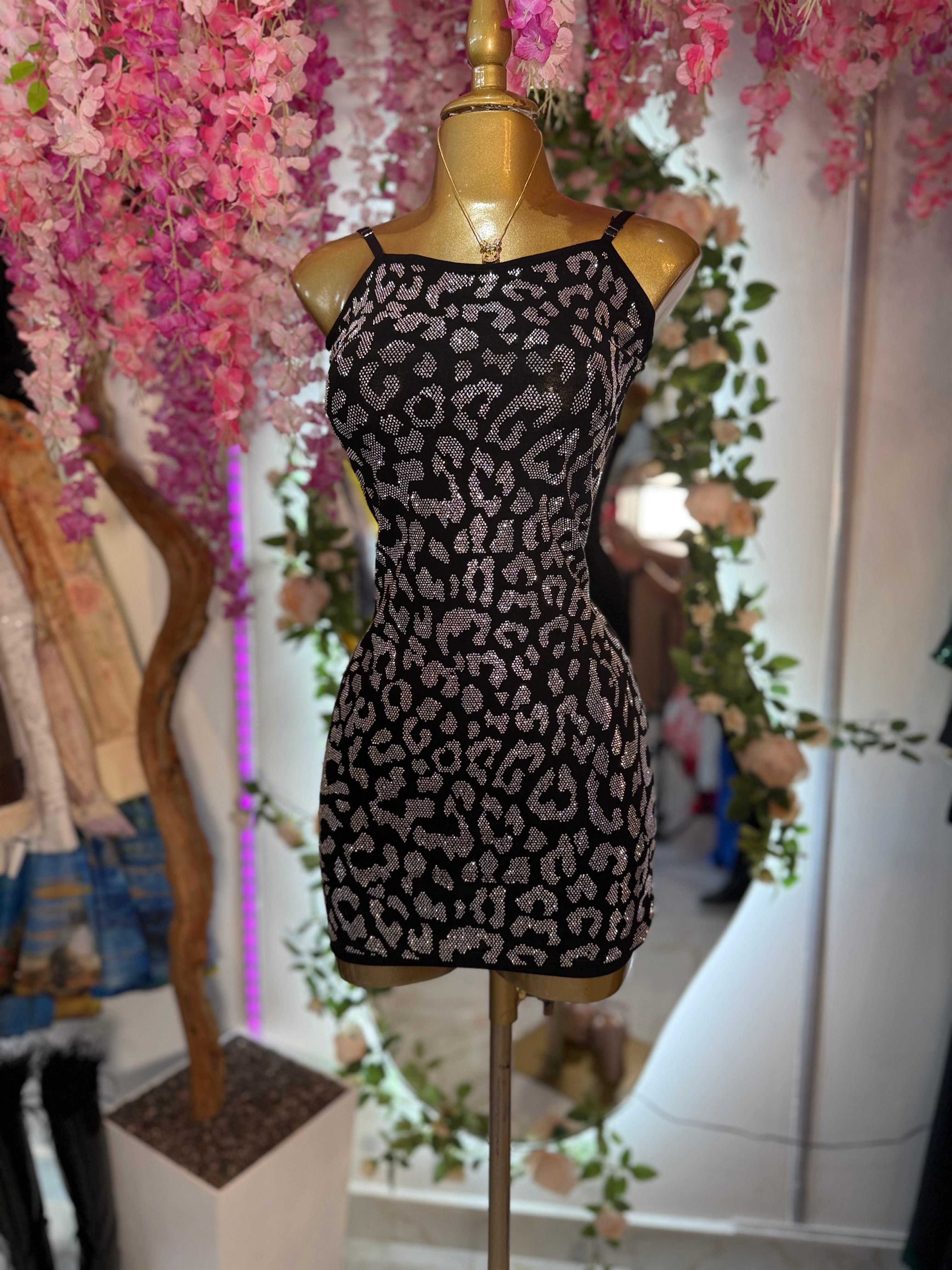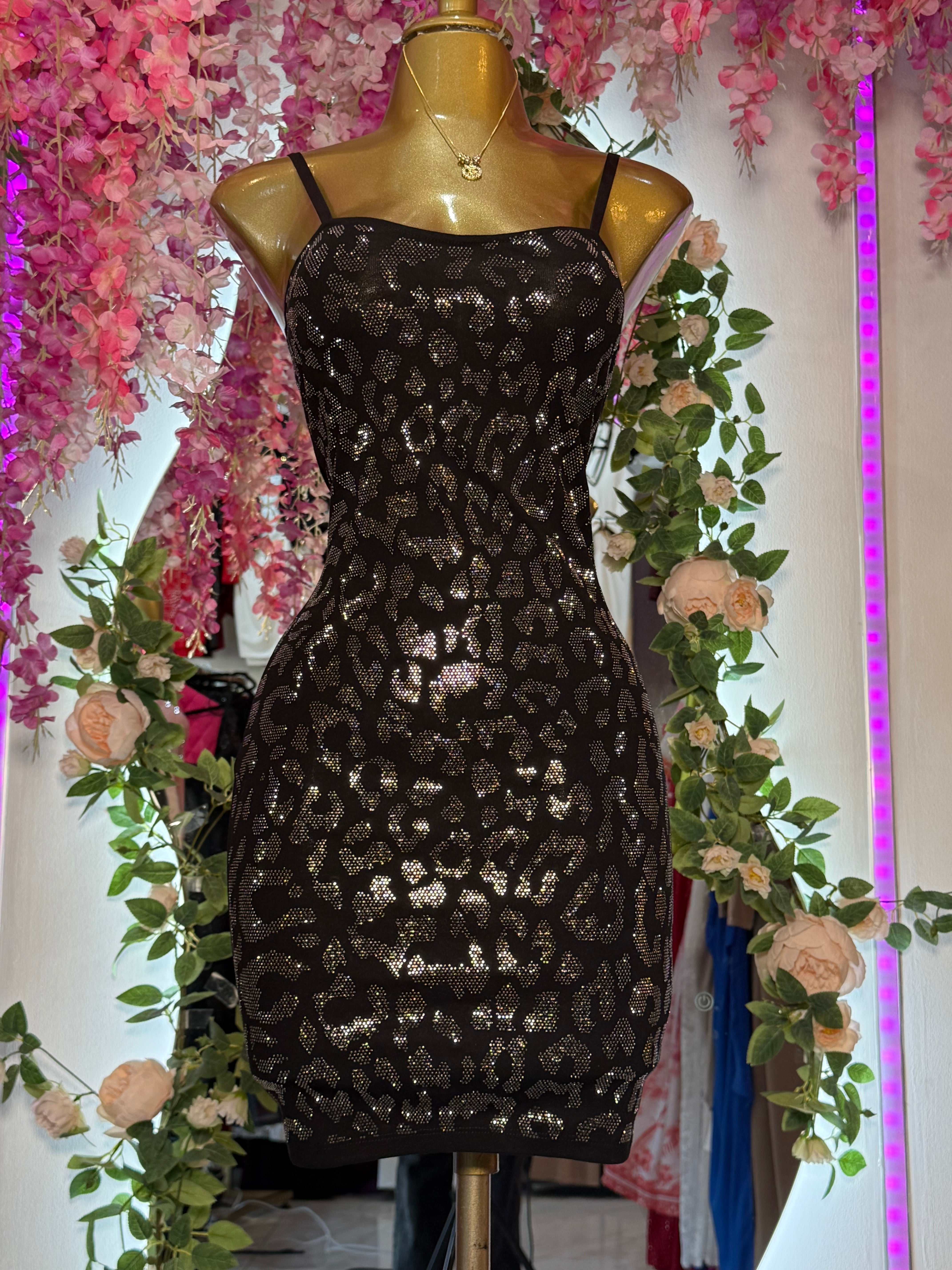 Vestido corto tipo bodycon confeccionado en tela elástica que se ajusta a la silueta y realza la figura. Presenta un estampado animal print con acabado brillante, ideal para un look glam y llamativo. Su diseño de tirantes delgados y escote recto aporta un toque femenino y moderno.