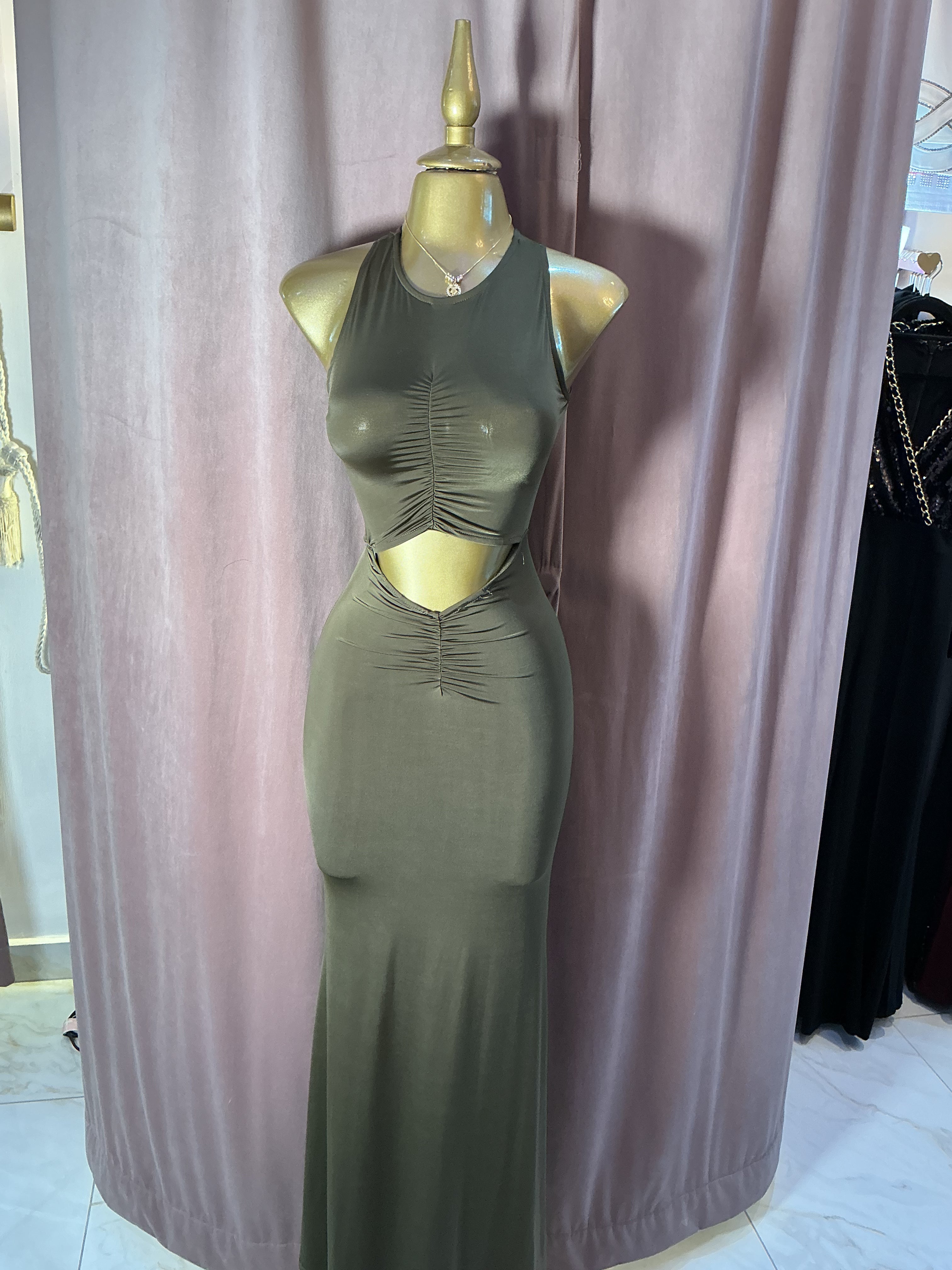 Atrévete a lucir una silueta impactante con este vestido largo de diseño moderno y sensual. Su corte cut out en la cintura resalta tu figura de forma sofisticada, mientras que el fruncido frontal en el busto y la falda estiliza y realza tus curvas de manera natural.