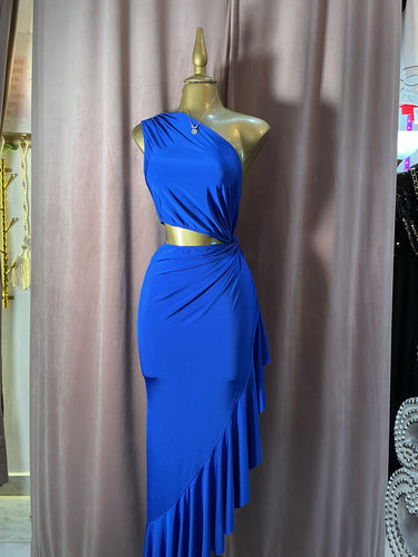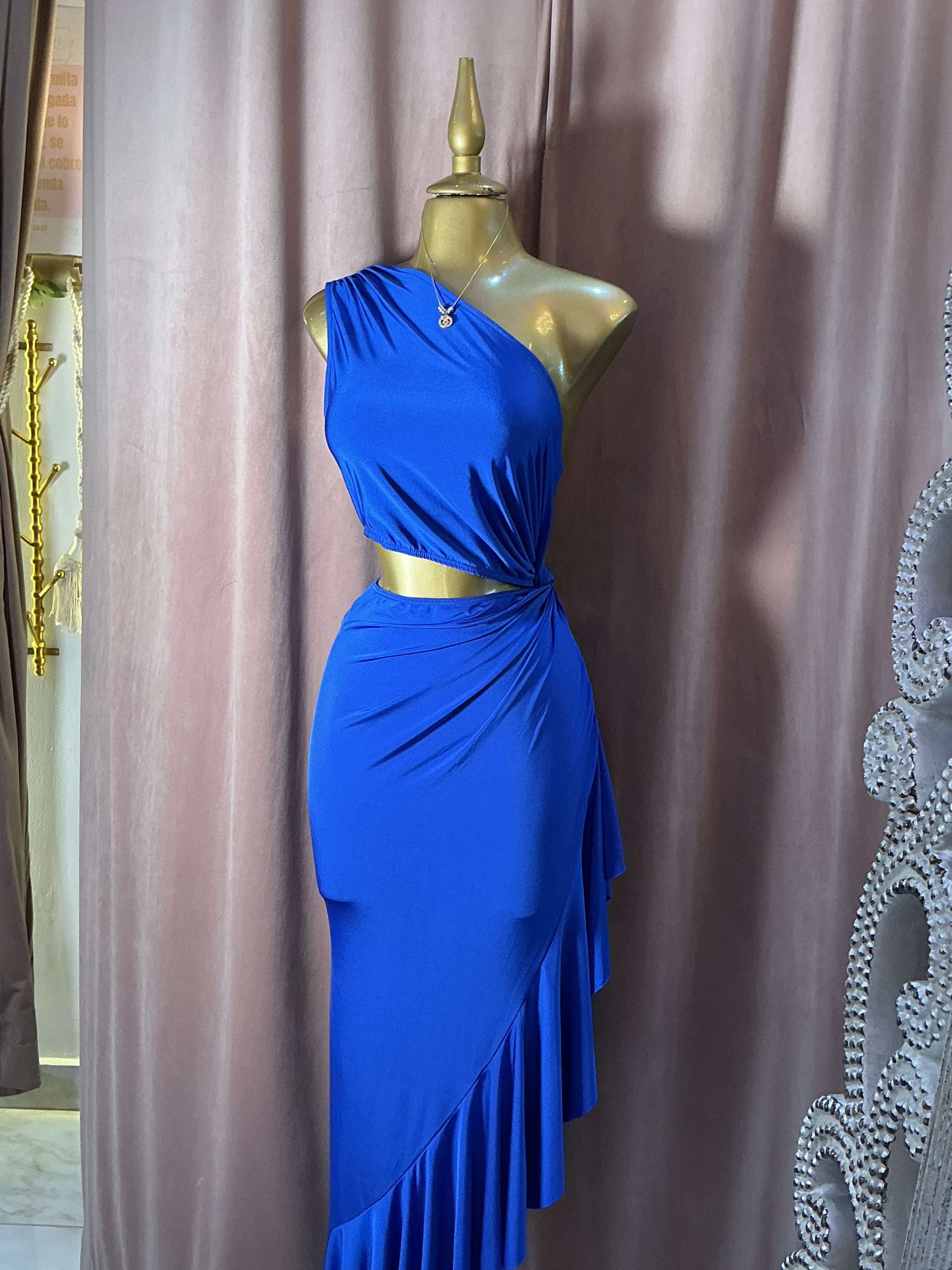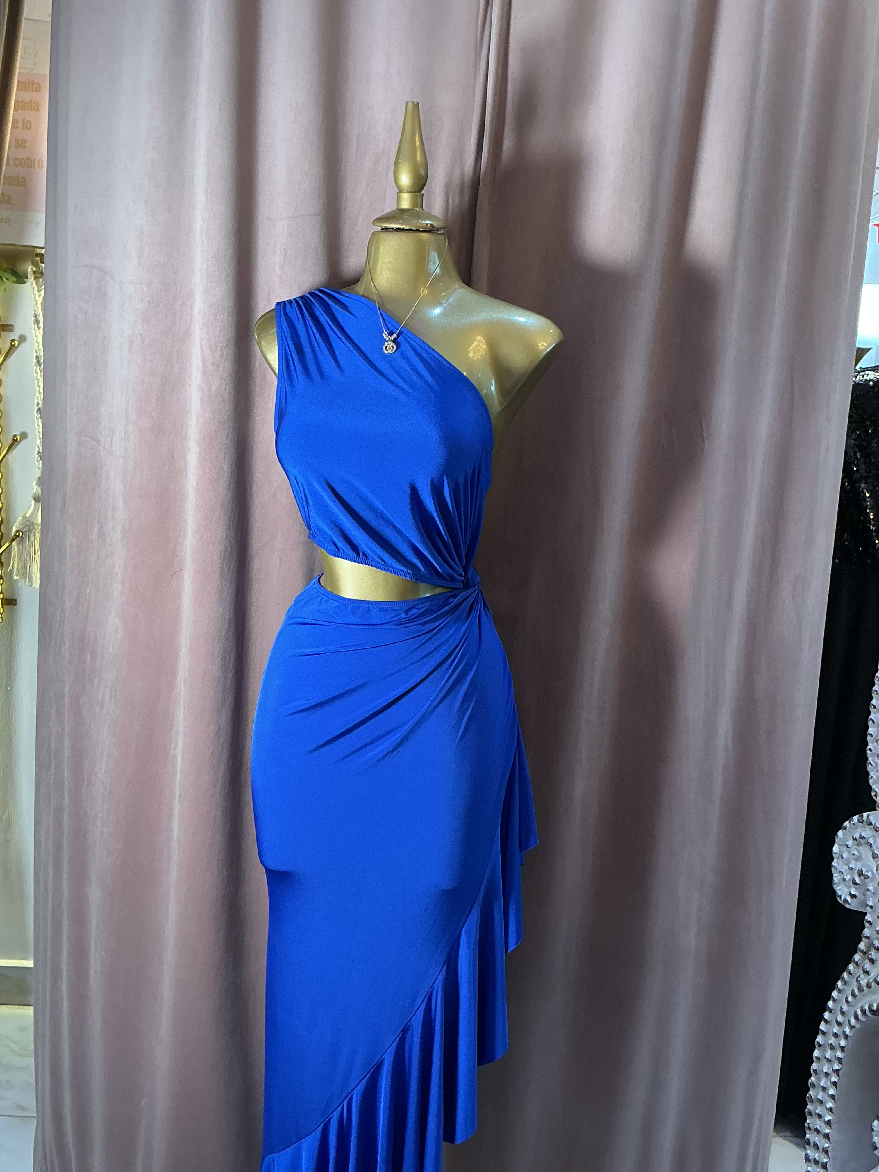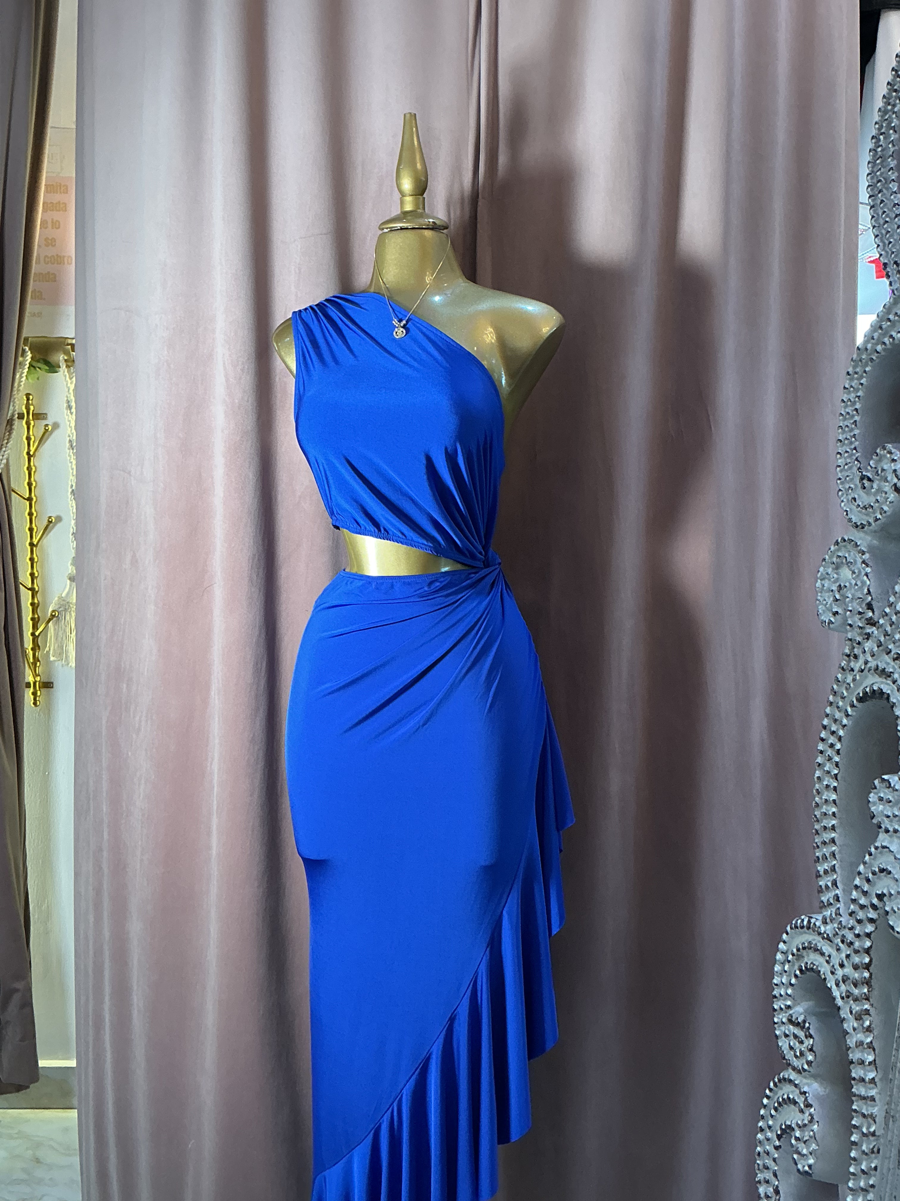 Destaca con un look sofisticado y moderno con este vestido largo en tono azul rey. Su diseño de un solo hombro aporta un aire elegante y contemporáneo, mientras que el cut out lateral en la cintura define la silueta de forma sutil y femenina.