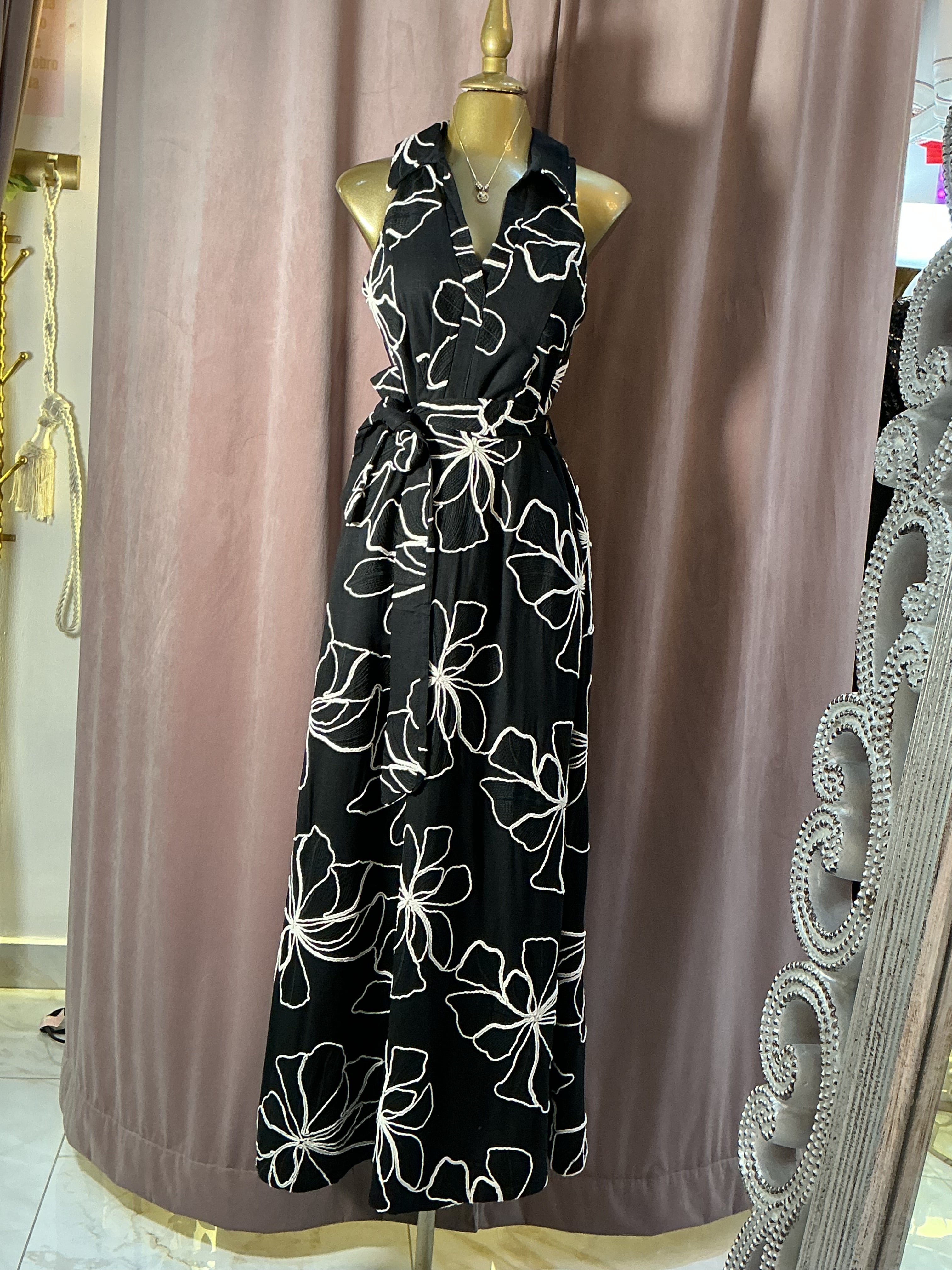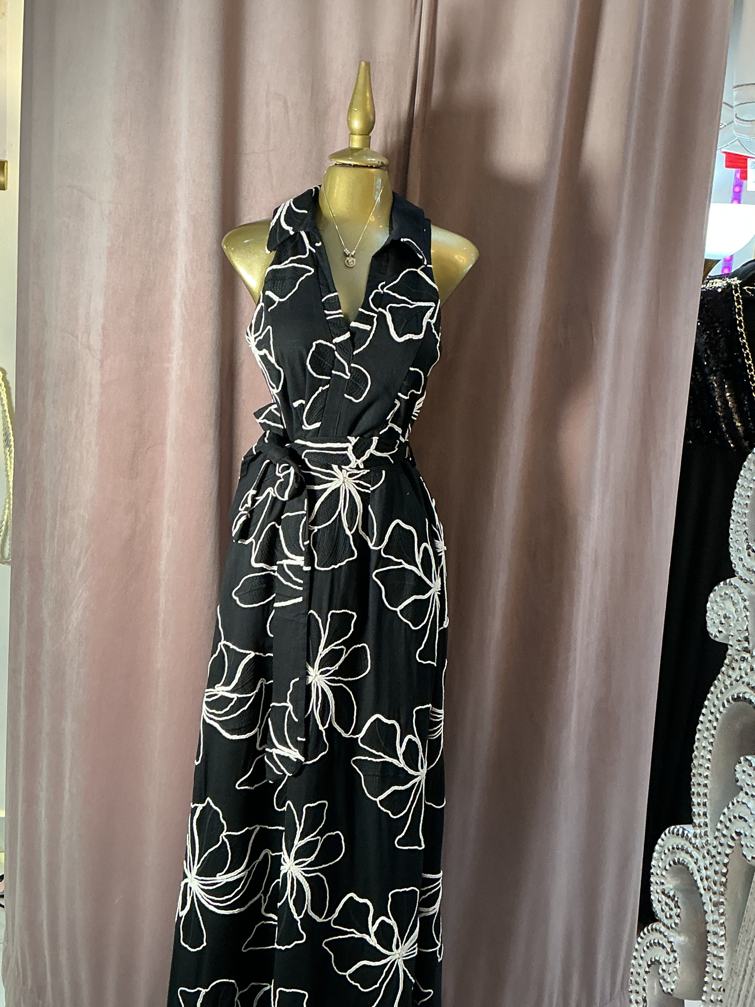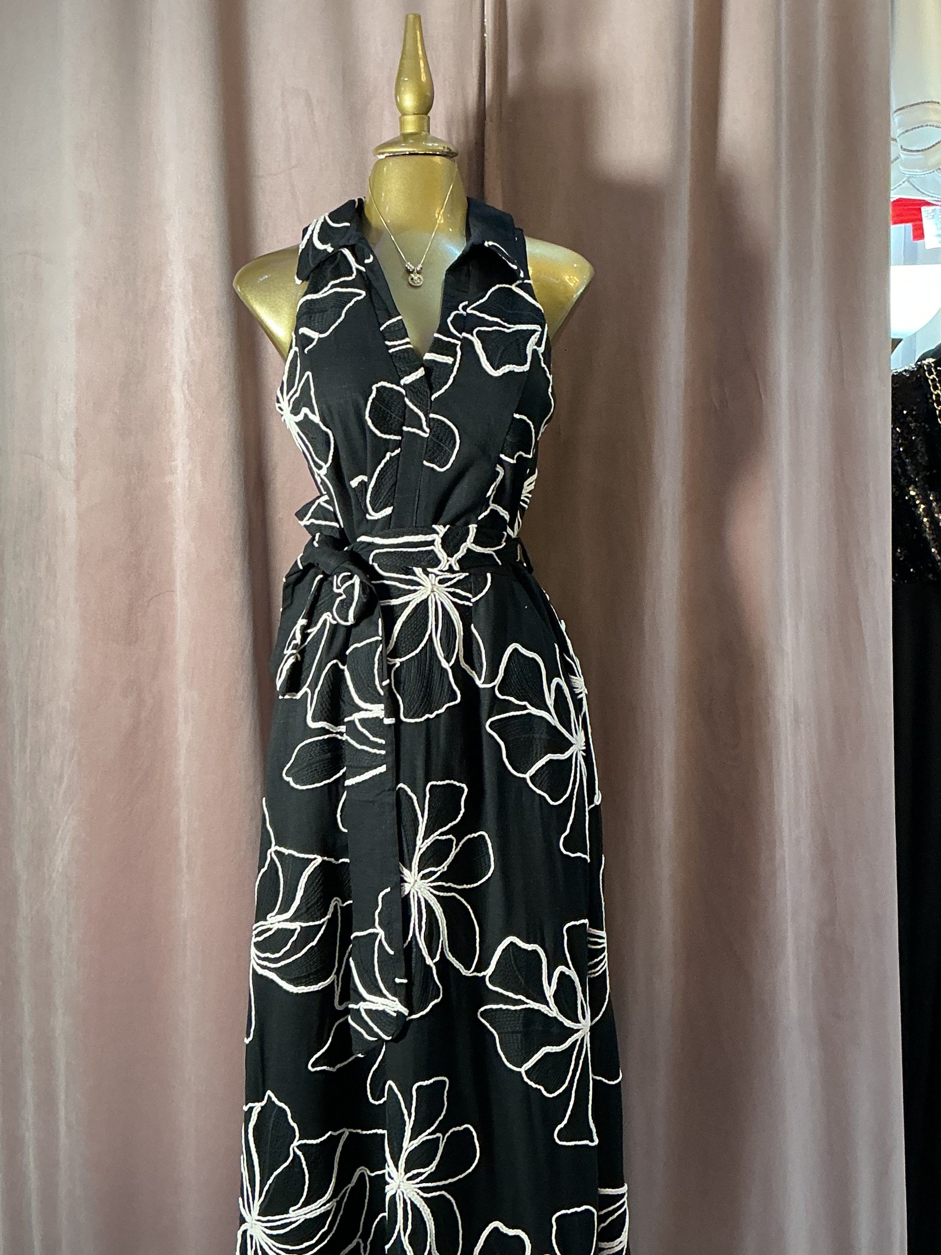 Este vestido largo en color negro con delicado estampado floral en trazo blanco combina sofisticación y frescura en un diseño atemporal. Su escote en “V” y corte sin mangas estilizan la parte superior, mientras que el cinturón del mismo tejido define la cintura para una silueta femenina y favorecedora.