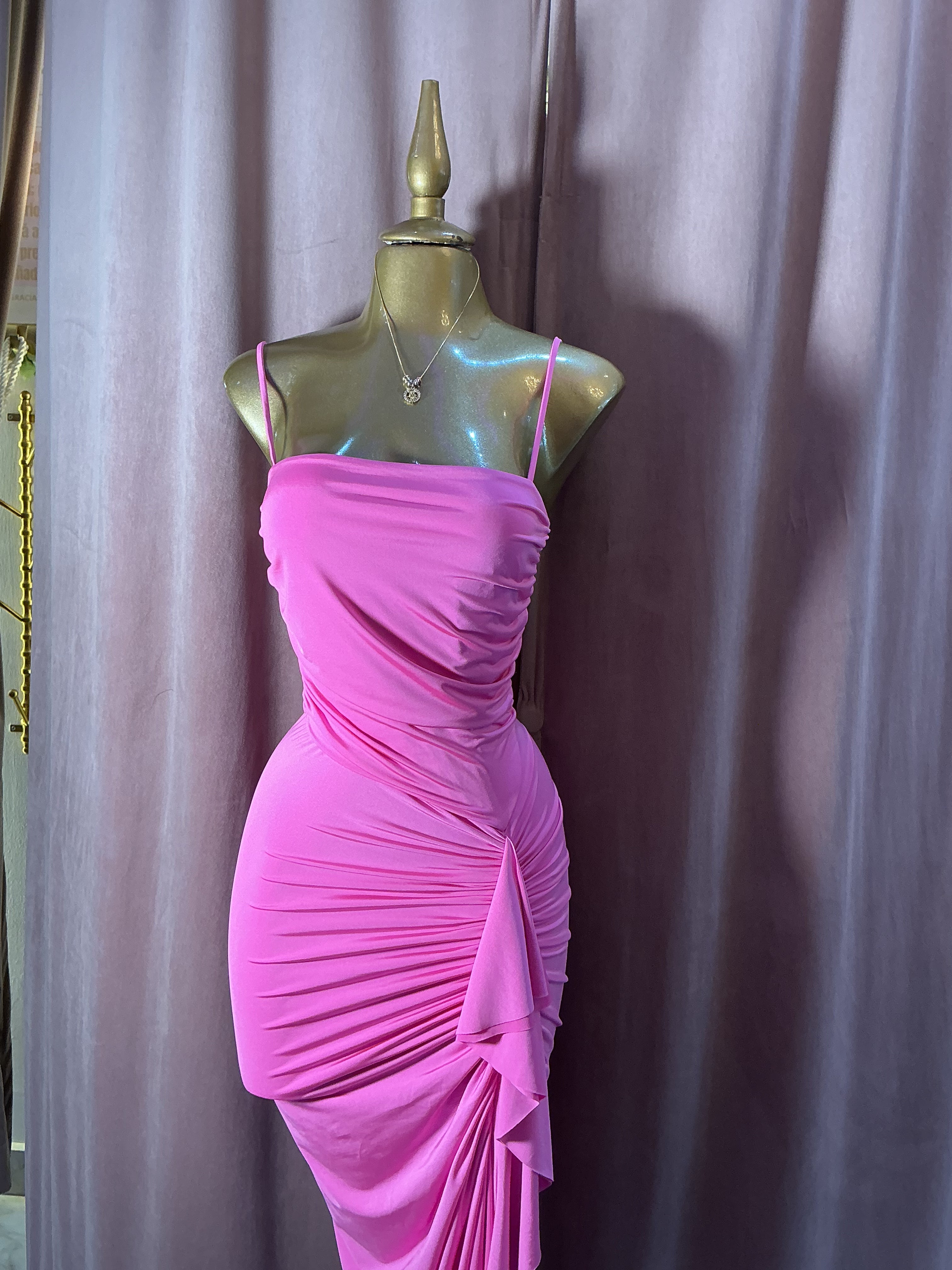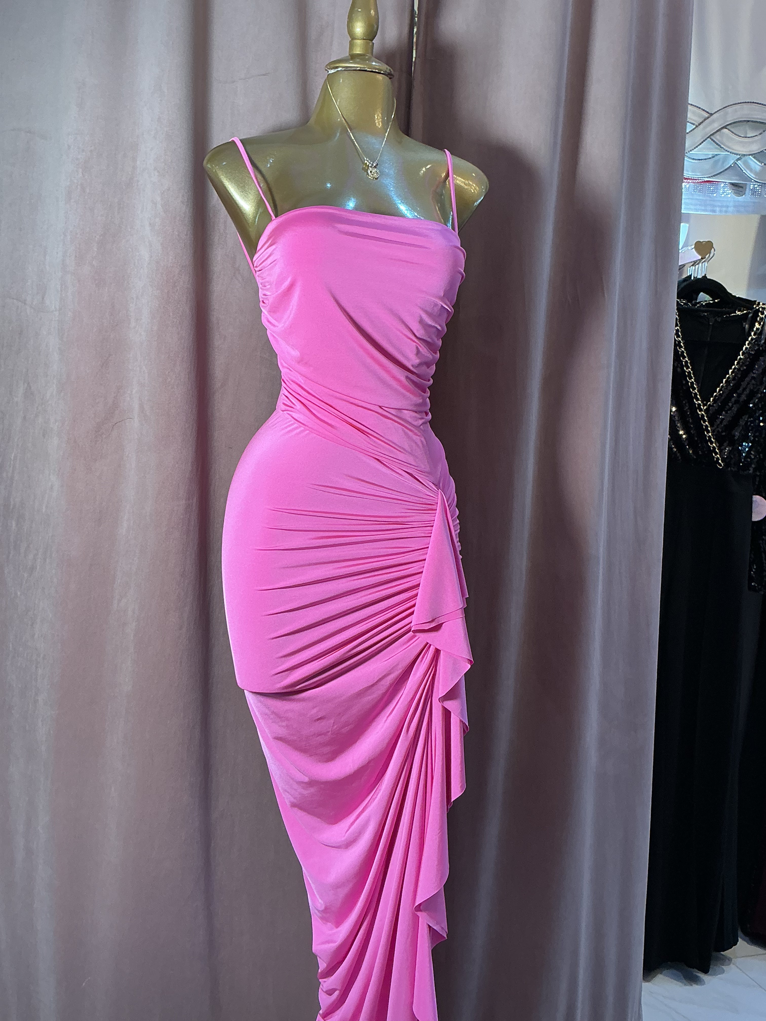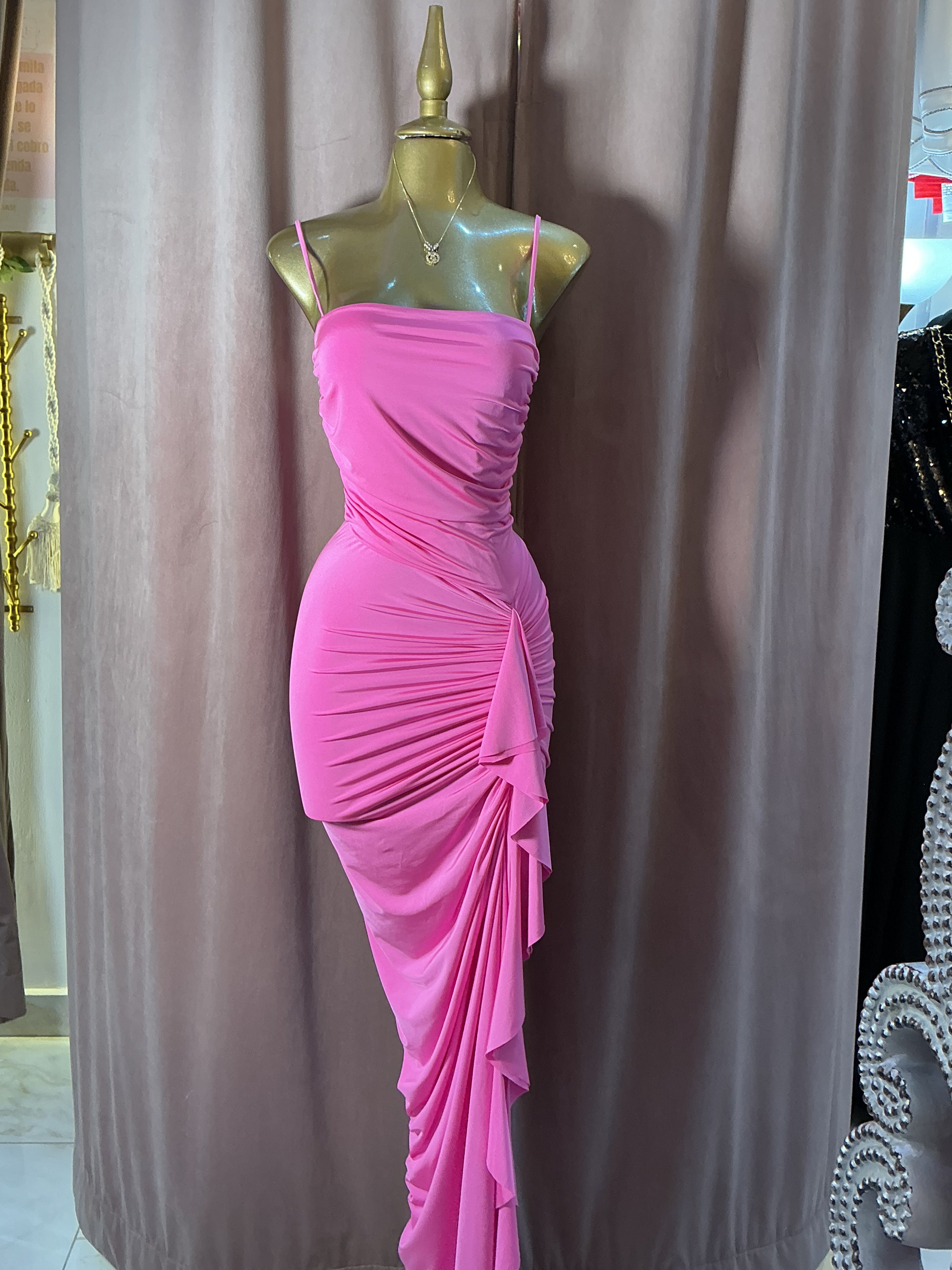 Luce femenina y sofisticada con este vestido largo en tono rosa vibrante, diseñado para realzar tu silueta con un estilo elegante y moderno. Su escote recto con tirantes delgados aporta delicadeza al diseño, mientras que el fruncido lateral estiliza la figura y crea un efecto visual que resalta las curvas de forma natural.