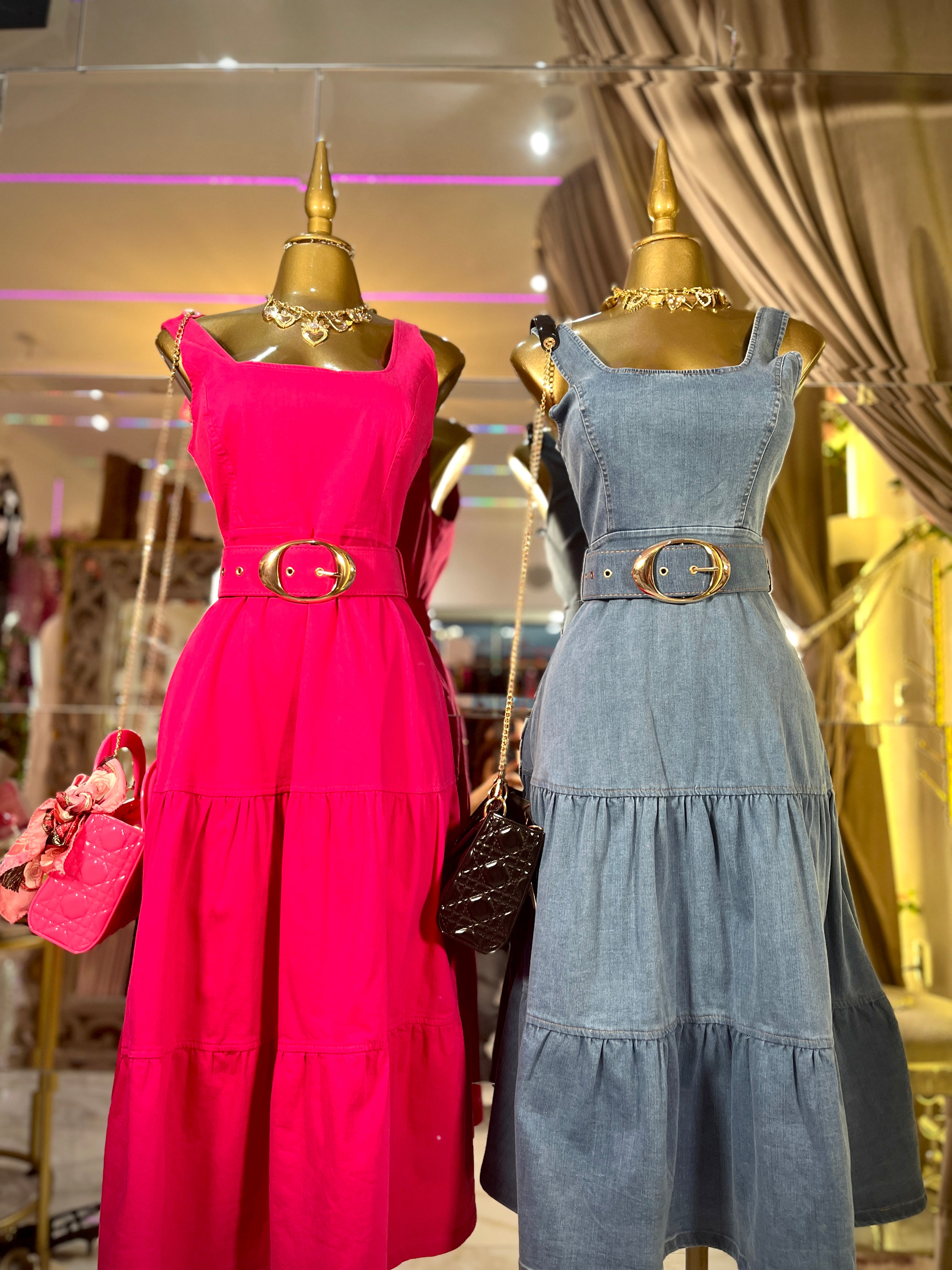 Luce femenina y elegante con este vestido midi de silueta estructurada que realza la figura de forma natural. Su escote cuadrado y tirantes anchos brindan soporte y comodidad, mientras que el cinturón con hebilla metálica dorada define la cintura y añade un toque sofisticado. La falda de caída amplia con olanes aporta movimiento y estilo, ideal para un look versátil de día o de noche.