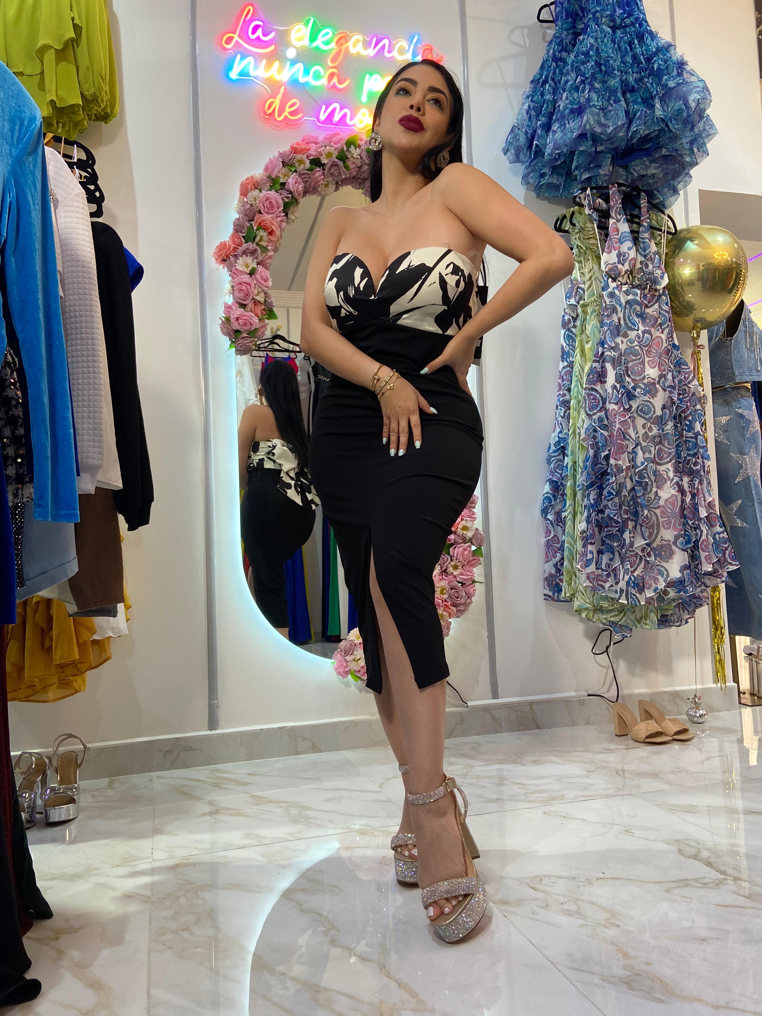 Este vestido negro y nude es sinónimo de elegancia y sensualidad. Con un diseño de mono y una espectacular espalda descubierta, crea un look sofisticado y atrevido al mismo tiempo. El contraste entre el negro y el nude le da un toque moderno, mientras que la espalda al descubierto aporta un detalle sensual que no pasará desapercibido.