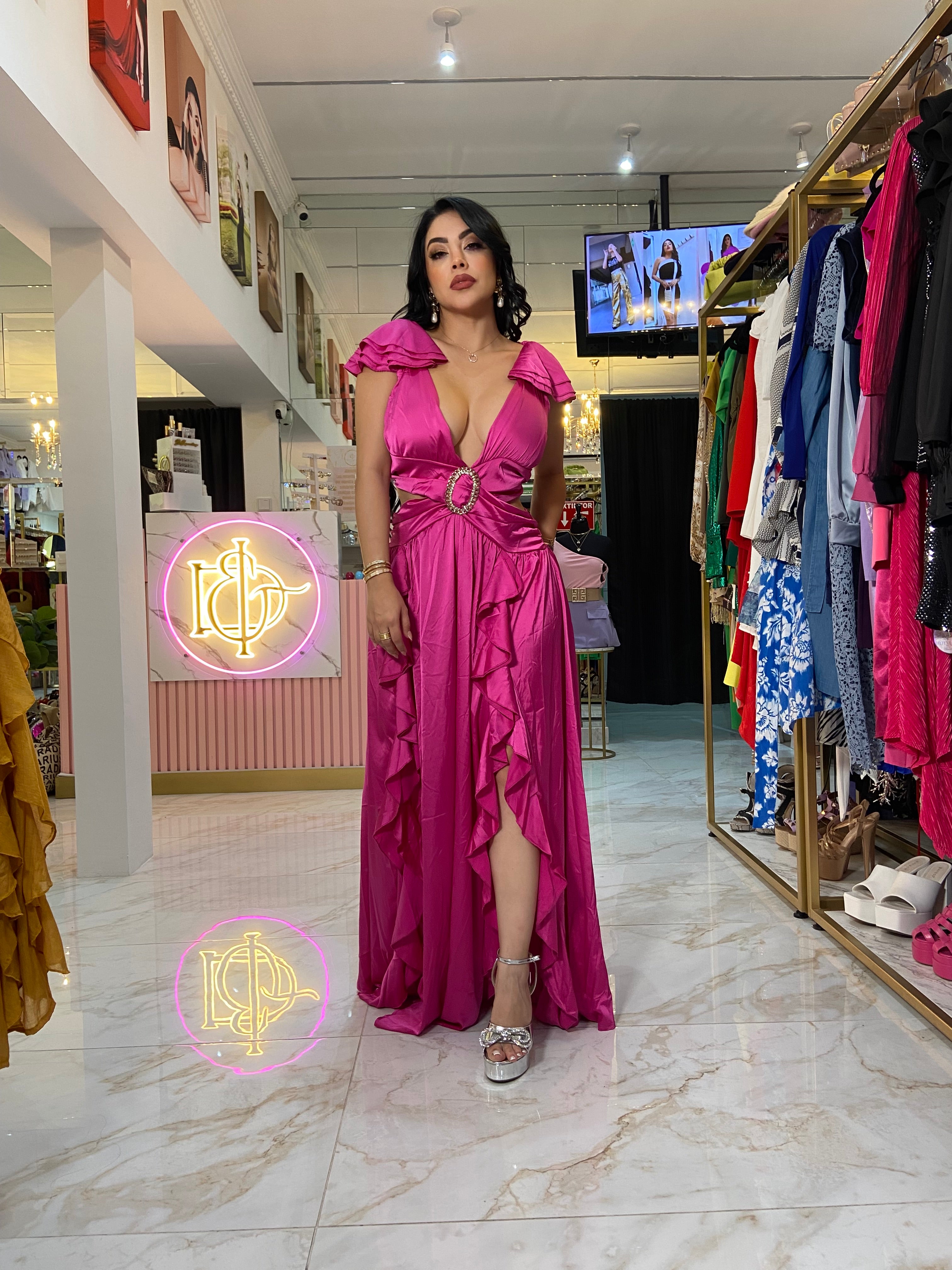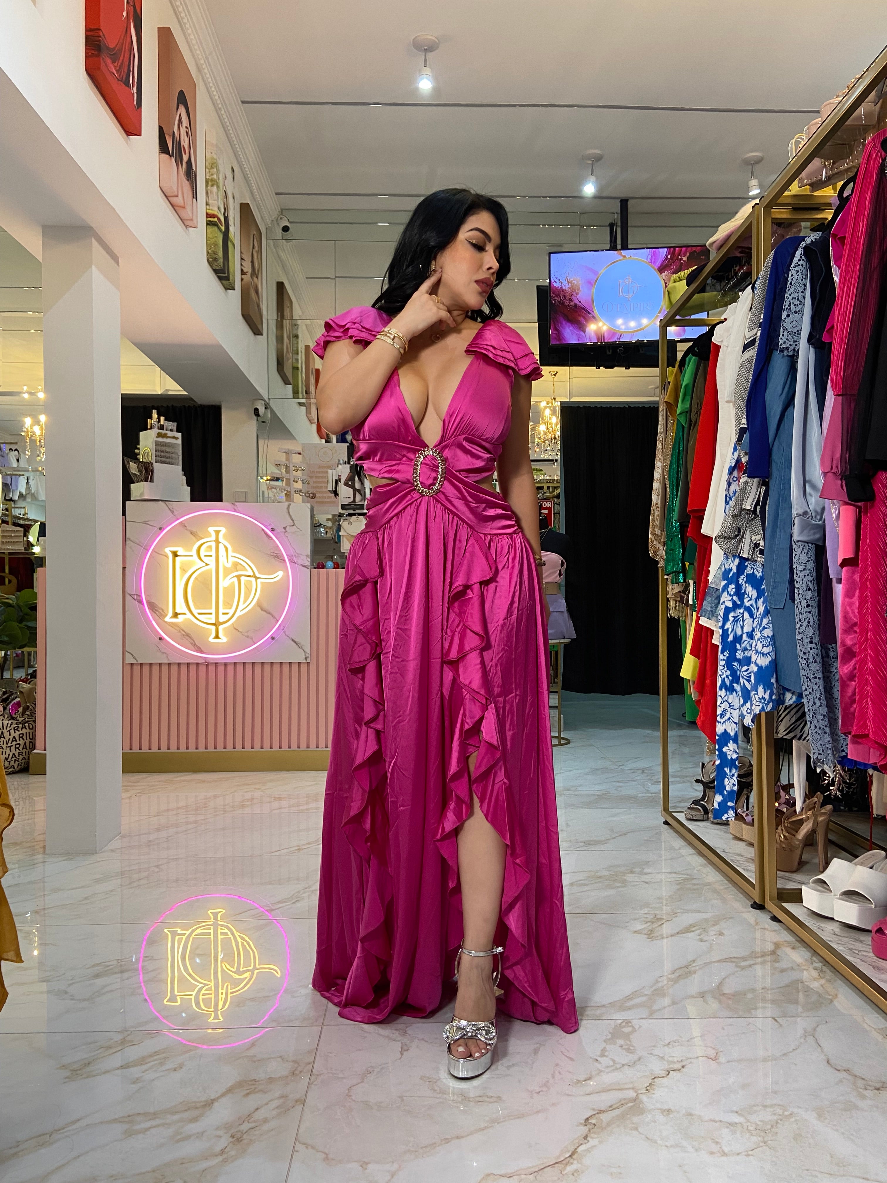 Este vestido rosa, con delicados olanes y un favorecedor escote en la cintura, es la mezcla perfecta de elegancia y feminidad. Su diseño resalta tu figura y te permite moverte con gracia en cualquier evento especial. Ideal para bodas, cenas o cualquier ocasión donde desees destacar.
