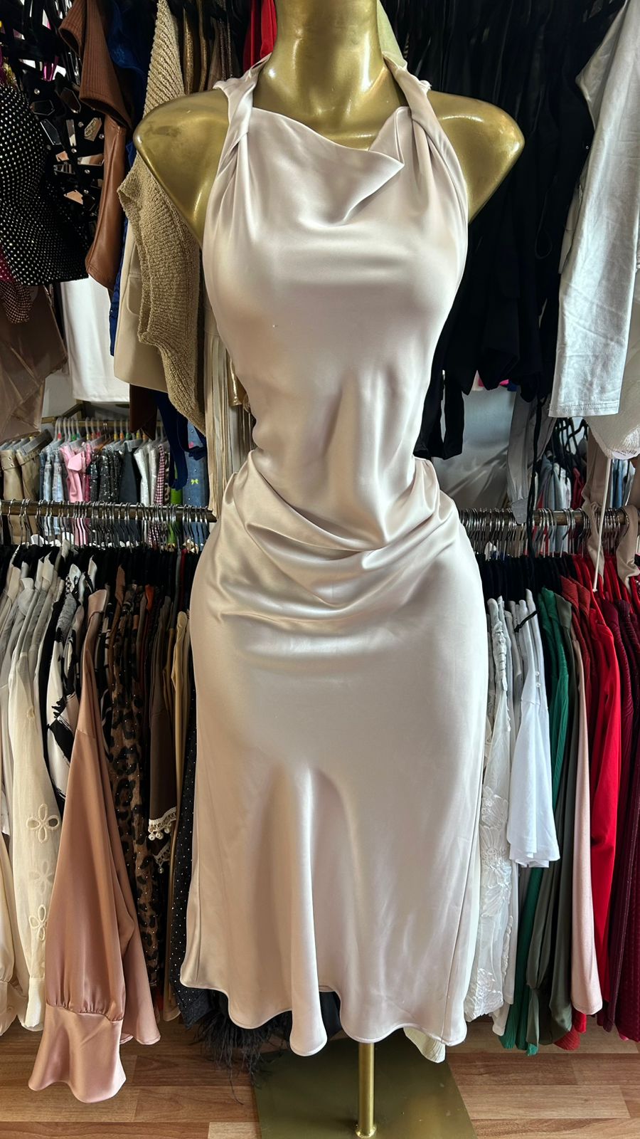 Este vestido en tono perla satinado resalta por su acabado suave y luminoso que aporta un look delicado y lujoso. Su escote halter con caída tipo drapeado en el busto crea un efecto fluido y femenino, mientras que el corte entallado en la cintura estiliza la silueta y realza las curvas de forma elegante.