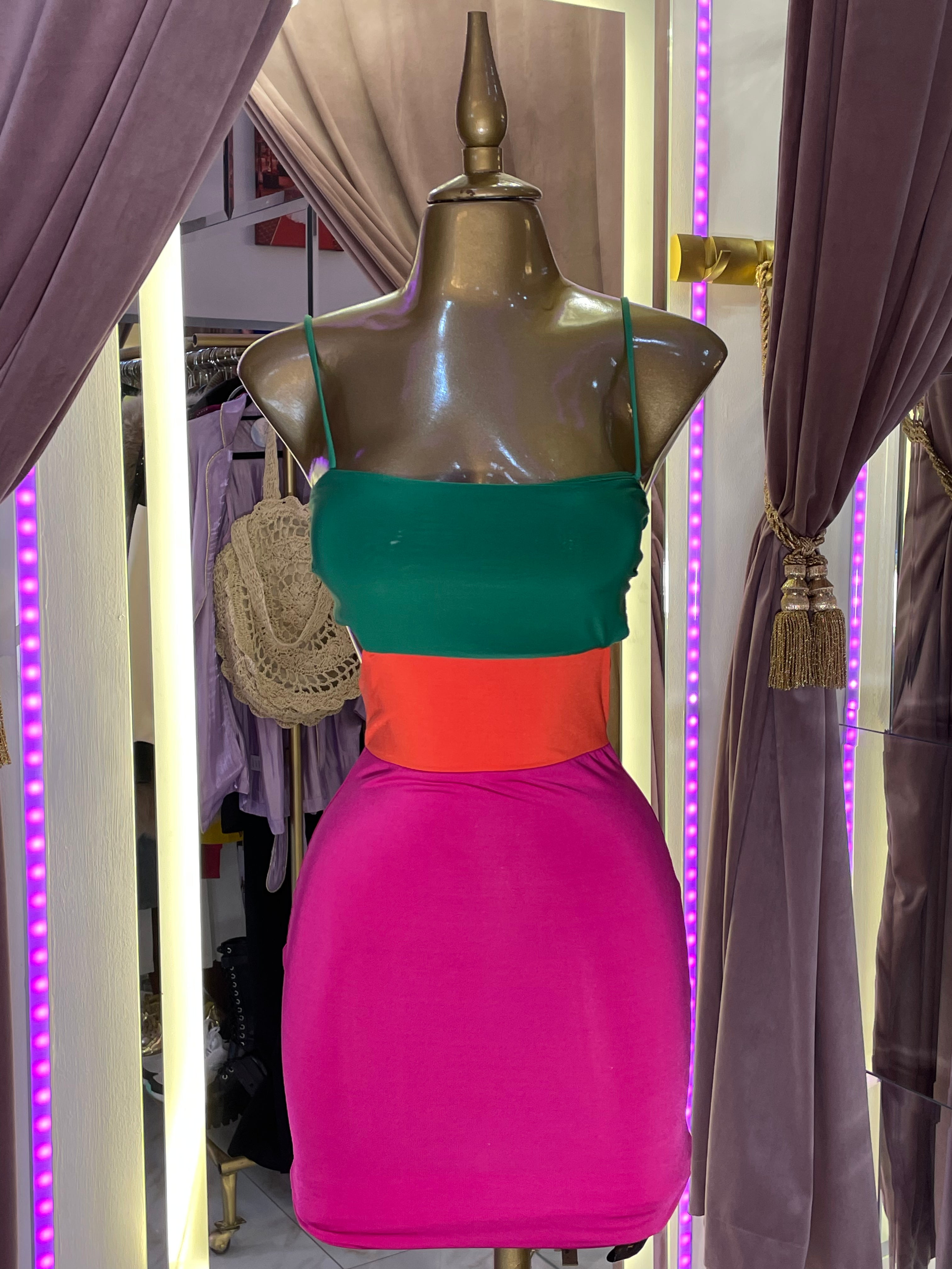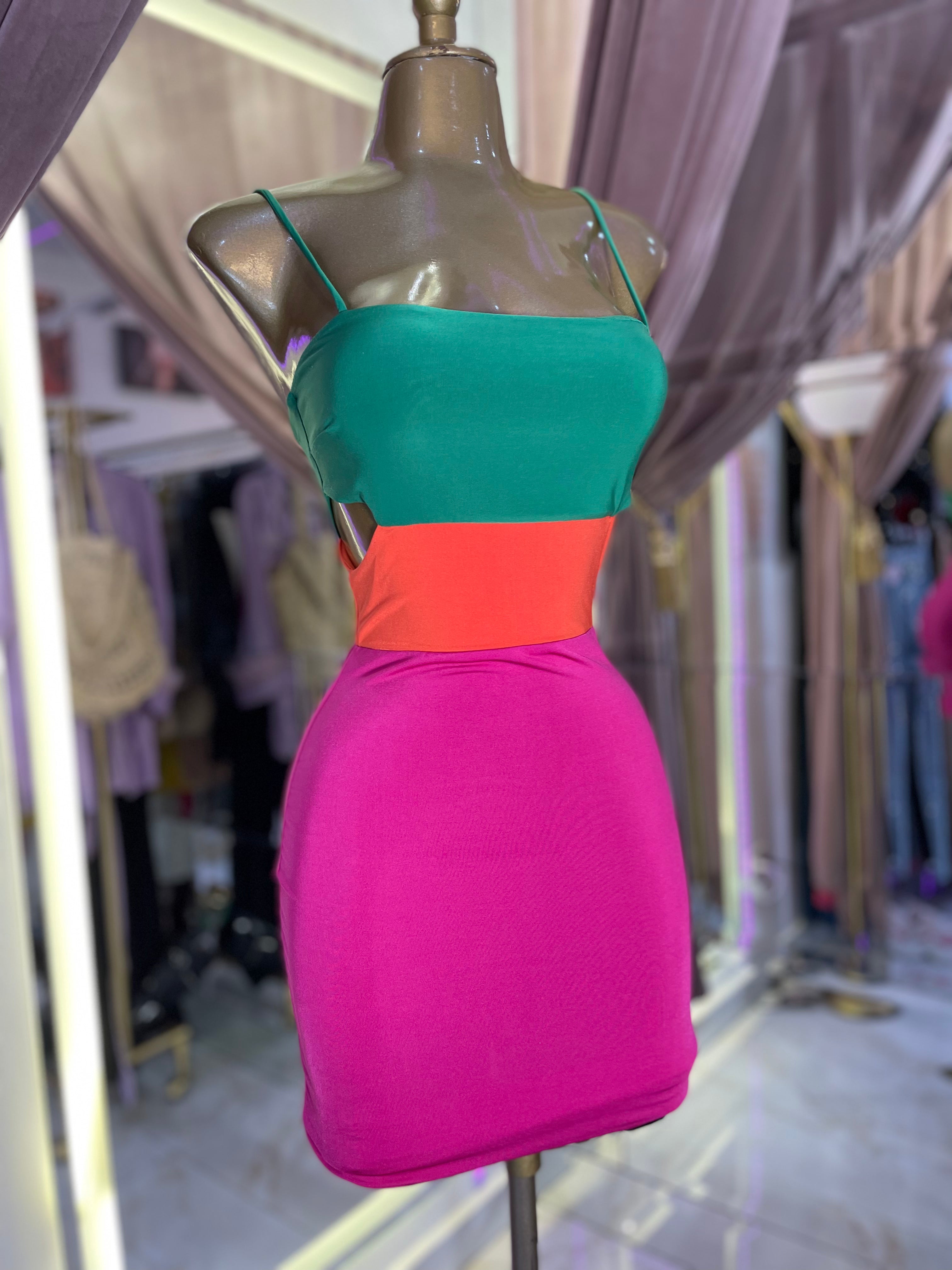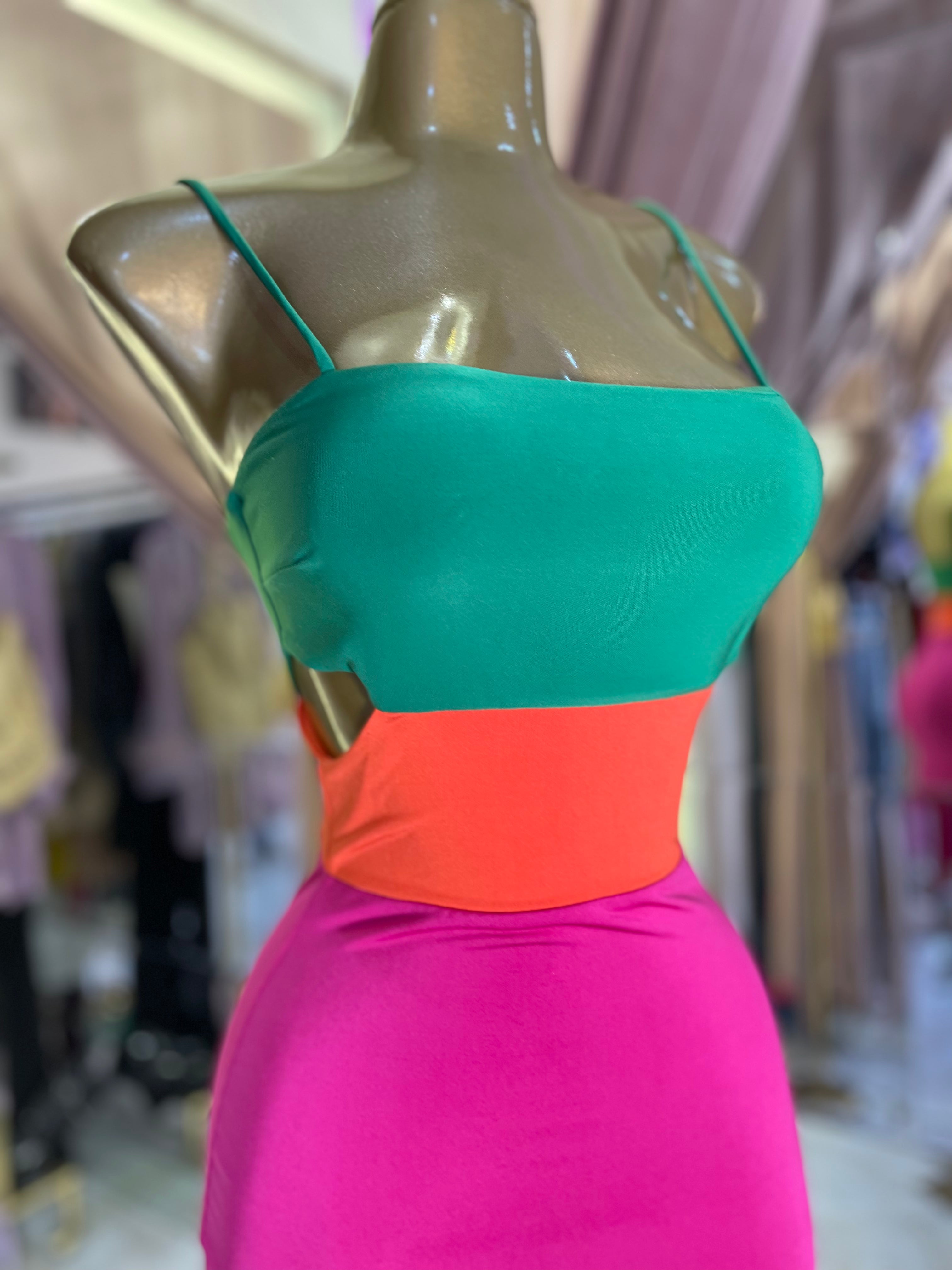 ¡Llegó el vestido perfecto para tus días de verano! Con su vibrante diseño de tirantes rosa y naranja, este vestido verde te mantendrá fresca y cómoda mientras luces fantástica. Combina colores alegres y un corte favorecedor para un look único y atrevido. ¡Atrévete a ser tú misma con este vestido!