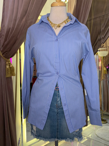 Esta camisa azul de rayas es una prenda que combina un diseño clásico con un toque moderno y urbano. En la parte frontal, las finas rayas verticales en tonos blanco y azul aportan un estilo fresco y elegante, mientras que el corte estructurado y el cuello clásico la convierten en una pieza versátil para cualquier ocasión.