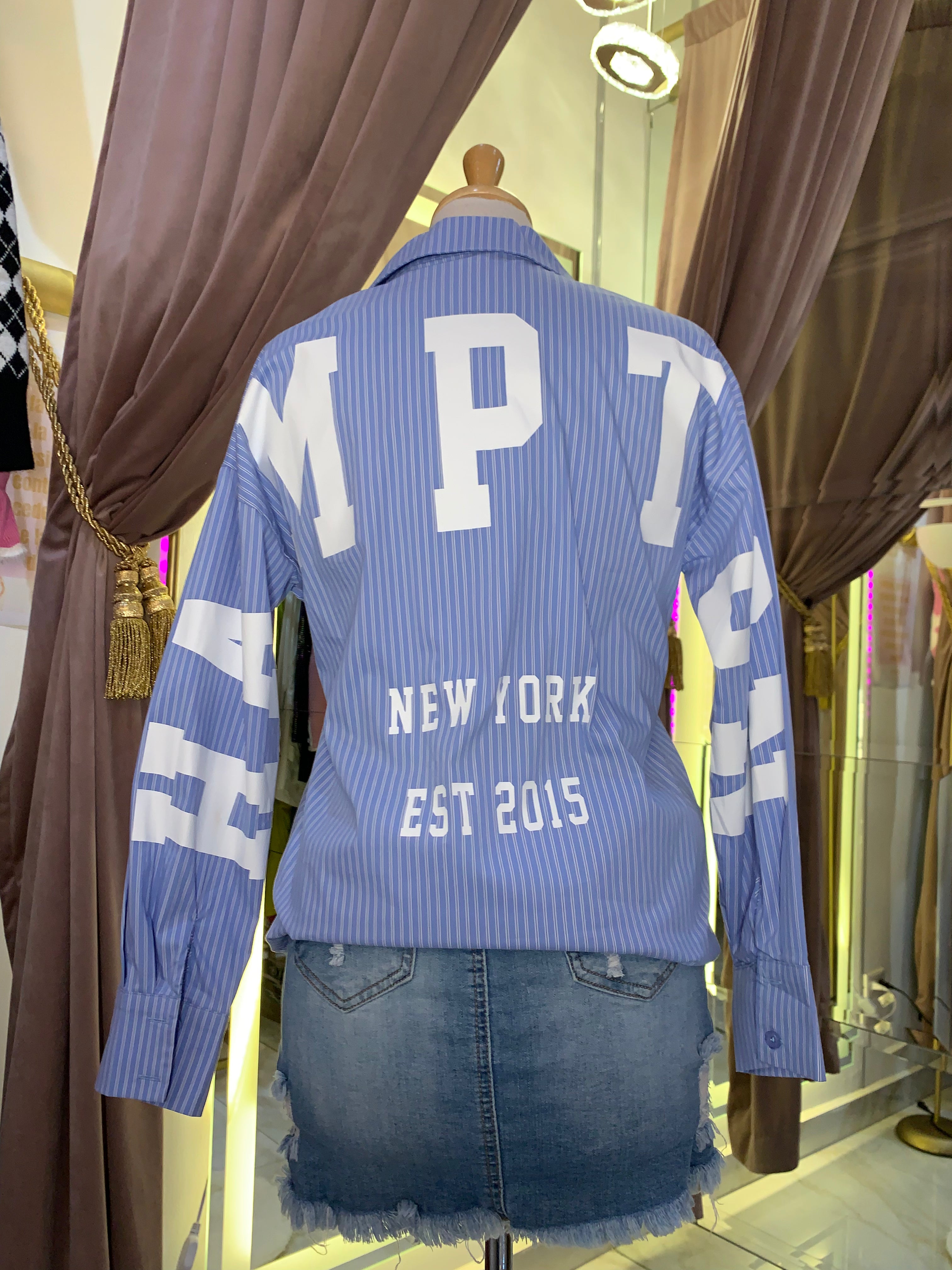 El detalle sorprendente se encuentra en la parte trasera, donde destacan letras grandes en blanco con las palabras "HAMPTON NEW YORK EST 2015", que le añaden un aire contemporáneo y juvenil. Este contraste entre lo clásico y lo moderno hace de esta camisa una opción ideal para looks casuales con un toque de personalidad.