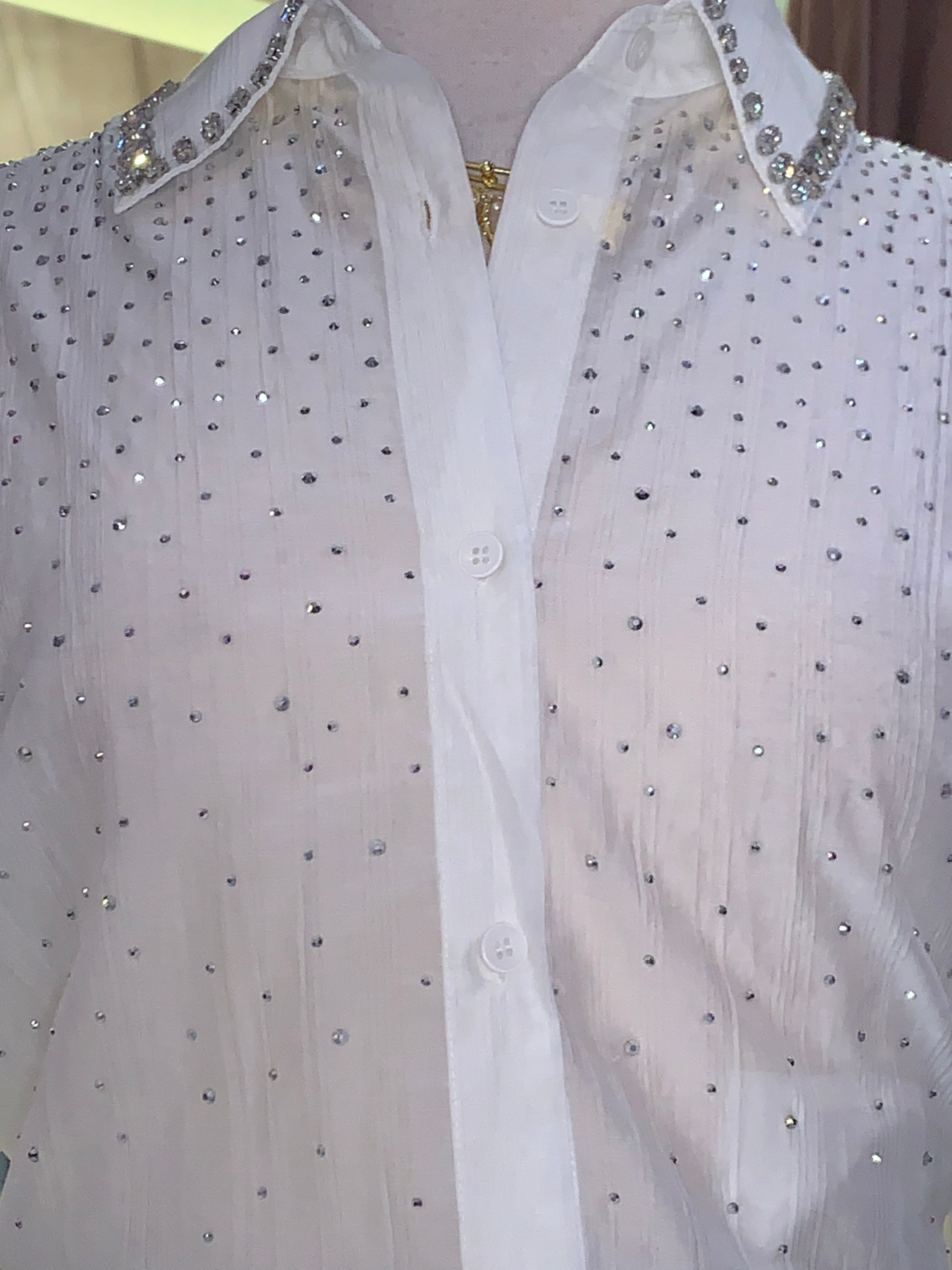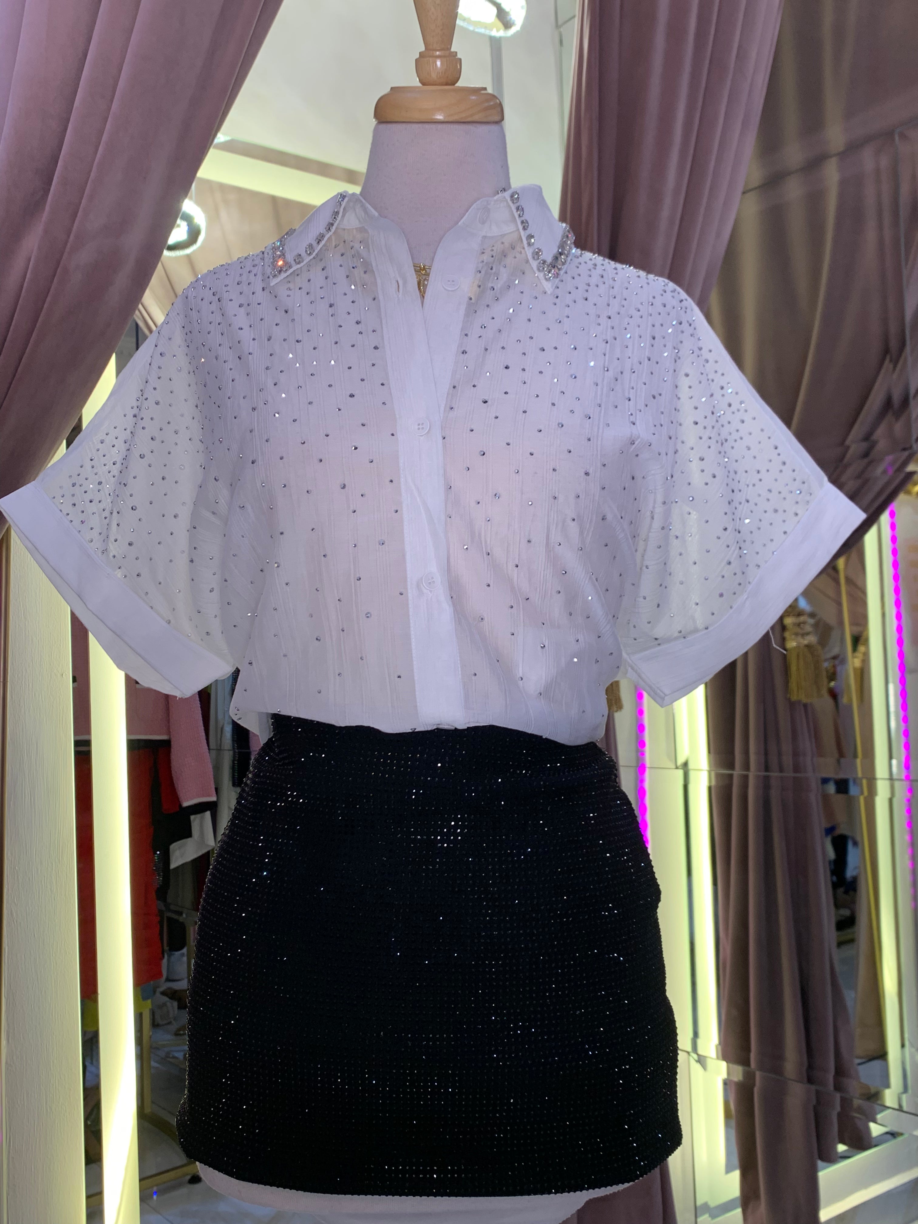Esta blusa de pedrería es una prenda versátil y elegante, diseñada para aportar un toque de glamour a cualquier outfit. Disponible en dos tonalidades, cada una ofrece un estilo único y sofisticado: