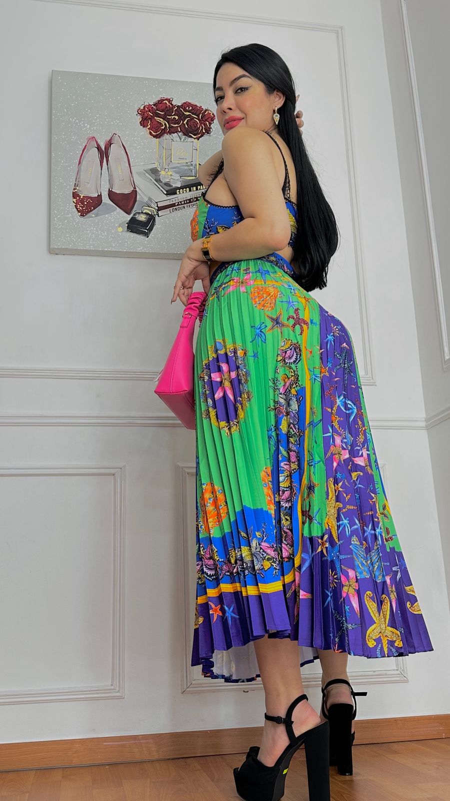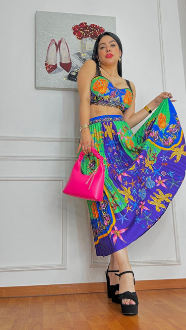 Explora la fusion perfecta de color y estilo con este vibrante set de falda y top. Con un diseño único en tonos morados, verdes y naranja, este conjunto esta hecho para quienes quieren destacar y expresar su creatividad a través de la moda.