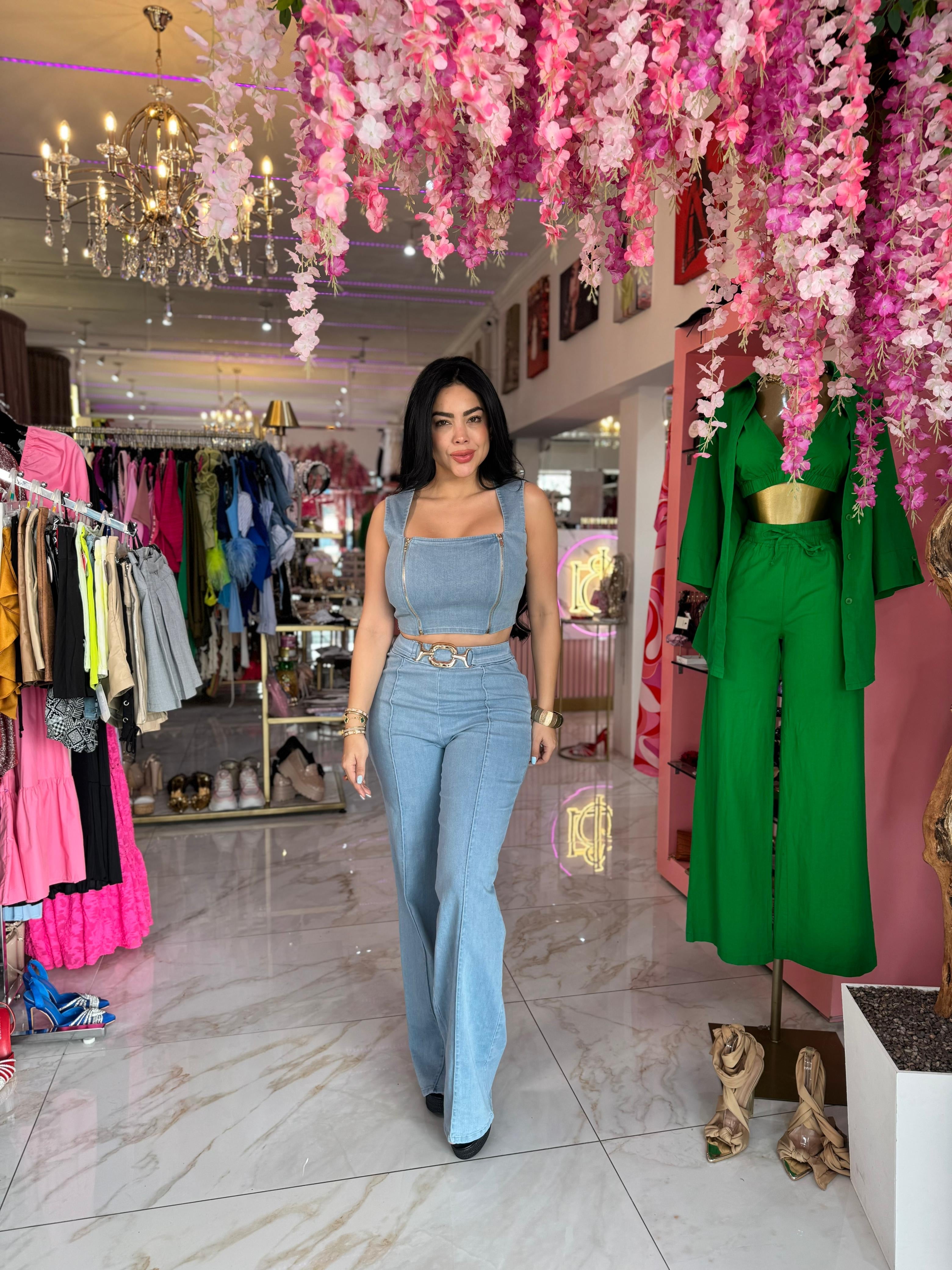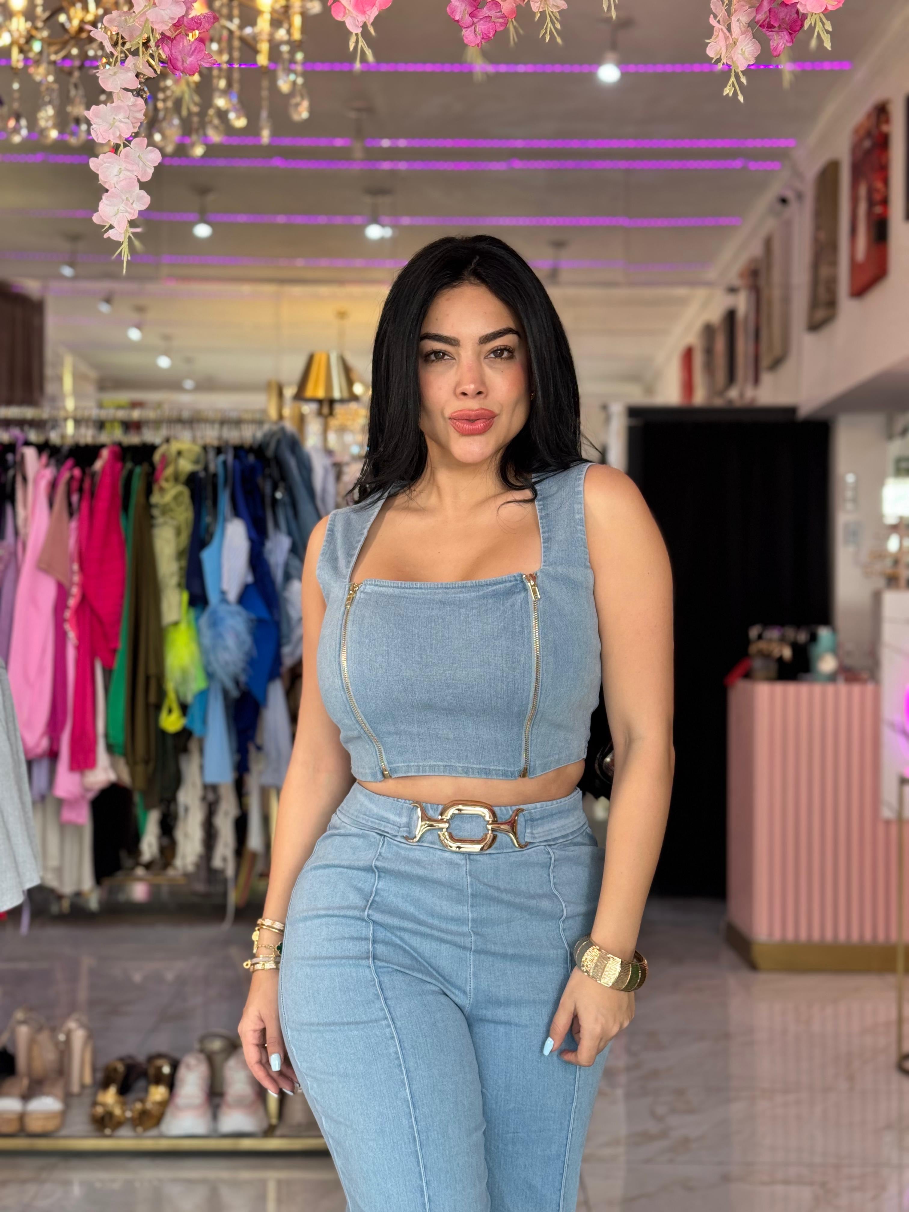 Descubre el equilibrio perfecto entre comodidad y estilo con este set de pantalón y chaleco de mezclilla. El chaleco, con dos cierres dorados, aportarán un toque audaz y moderno, mientras que el pantalón completa el look co un diseño cómodo y favorecedor.