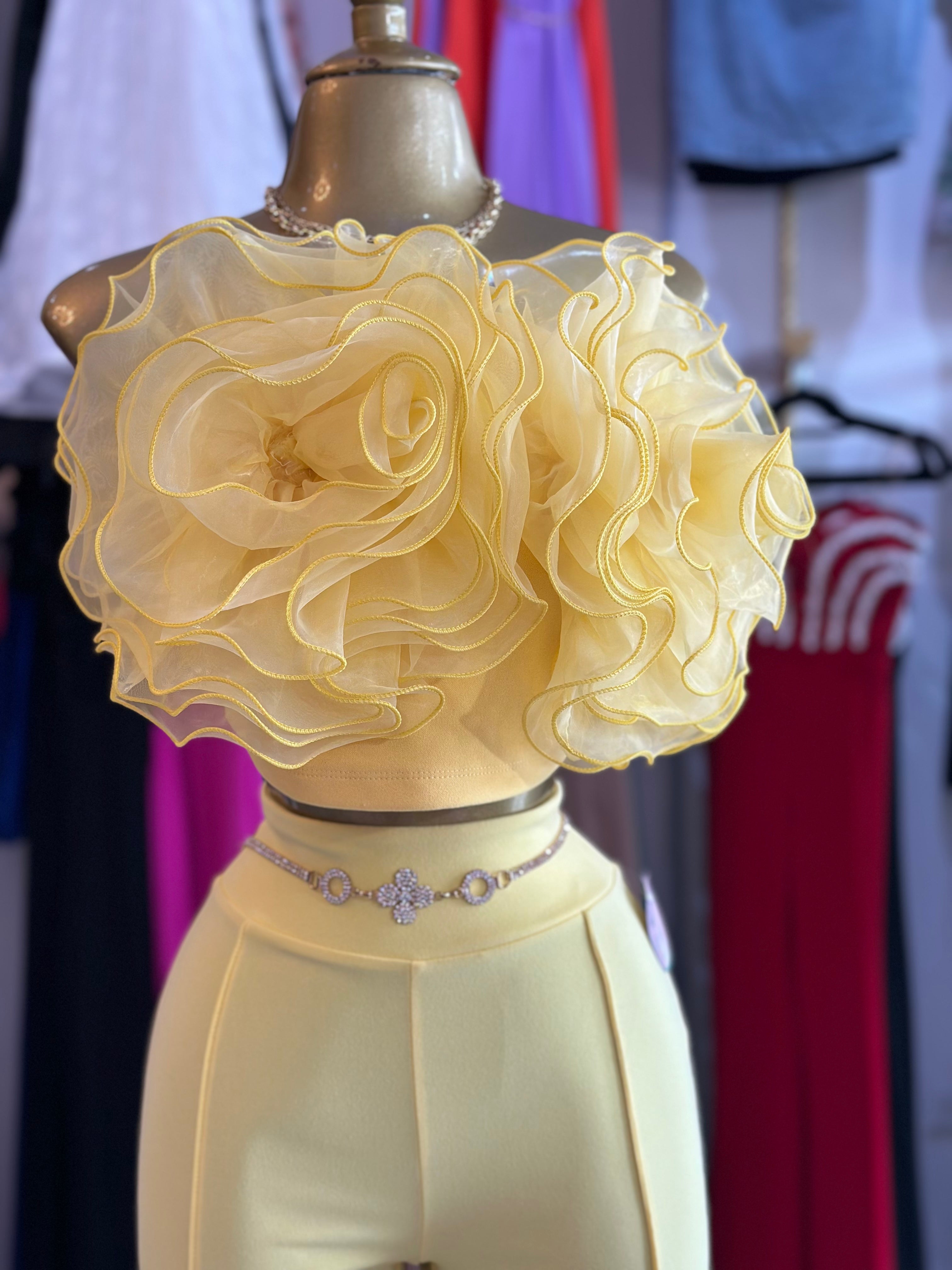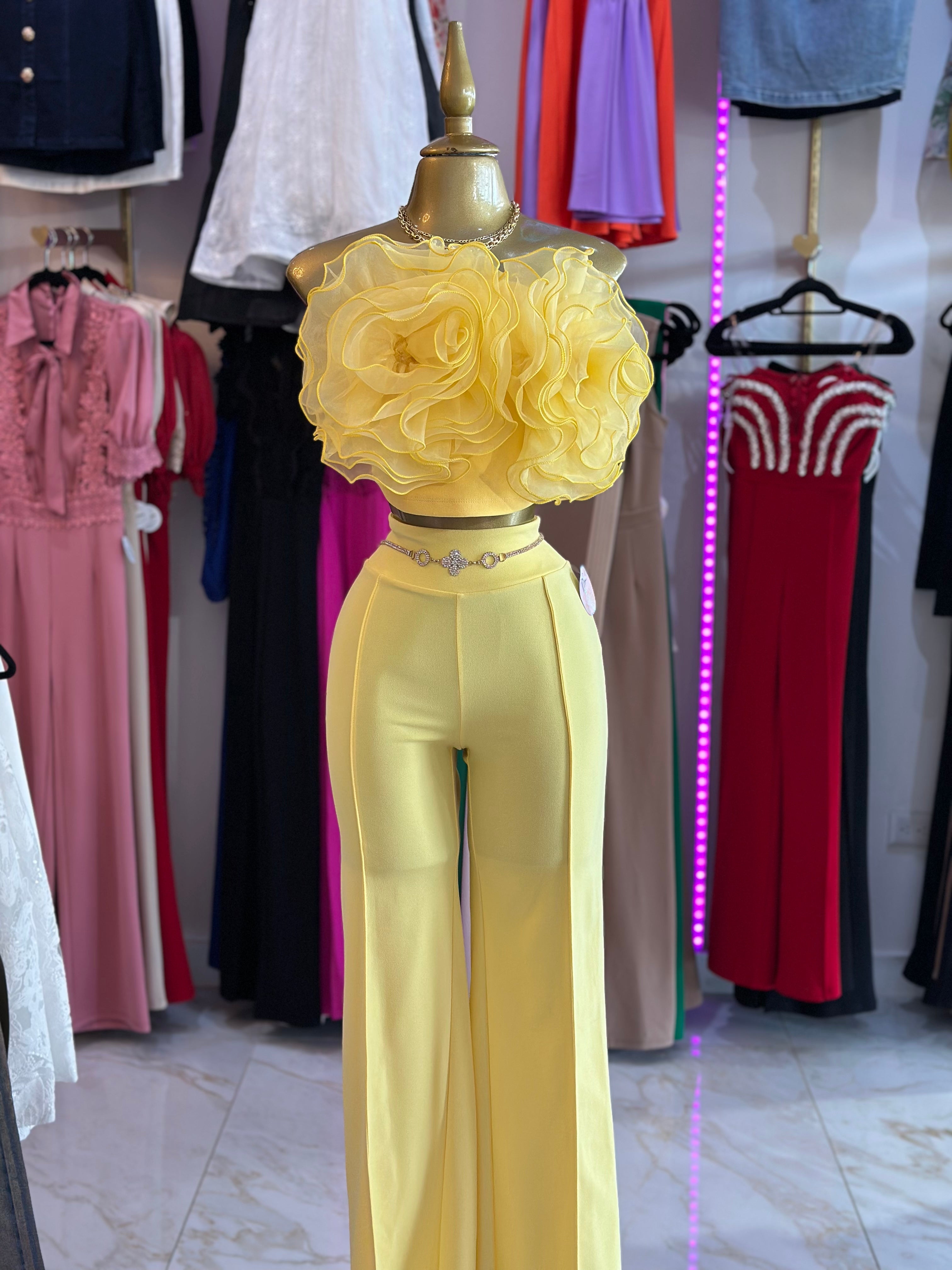 Llena tu look de energia y frescura con este vibrante set amarillo compuesto con un pantalón de corte favorecedor y un top en forma de flor que roba miradas. Ideal para días soleados, vacaciones o eventos especiales donde quieras destacar con un outfit original, femenino y lleno de color.