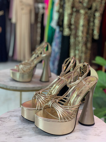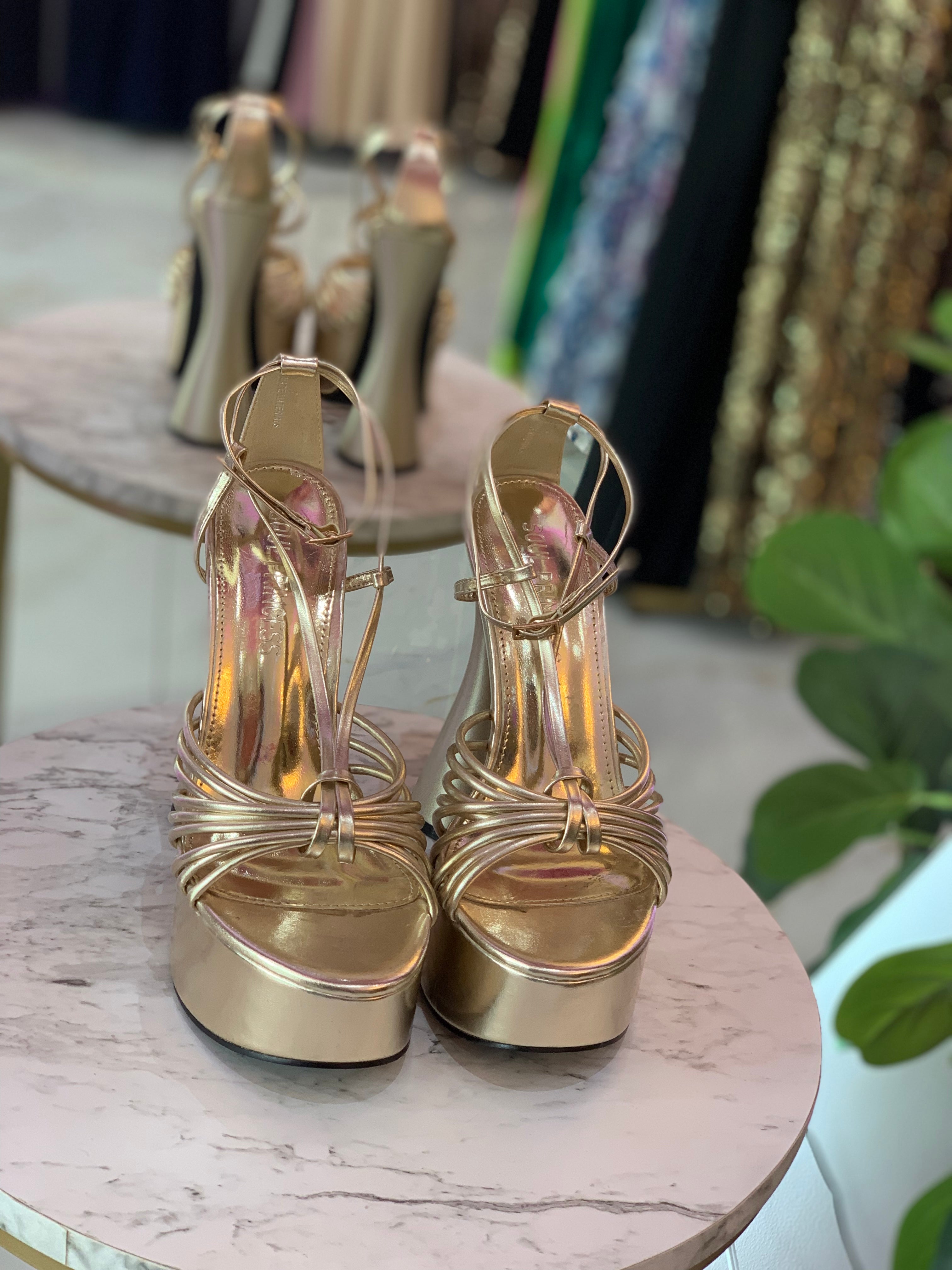 Este tacón dorado con tiras es sinónimo de elegancia moderna. Su diseño delicado realza la silueta del pie, mientras el acabado dorado aporta un toque de glamour perfecto para cualquier ocasión especial. Las tiras delgadas ofrecen un ajuste cómodo y femenino, ideal para combinar con vestidos de noche, looks de fiesta o conjuntos más casuales con un toque chic.