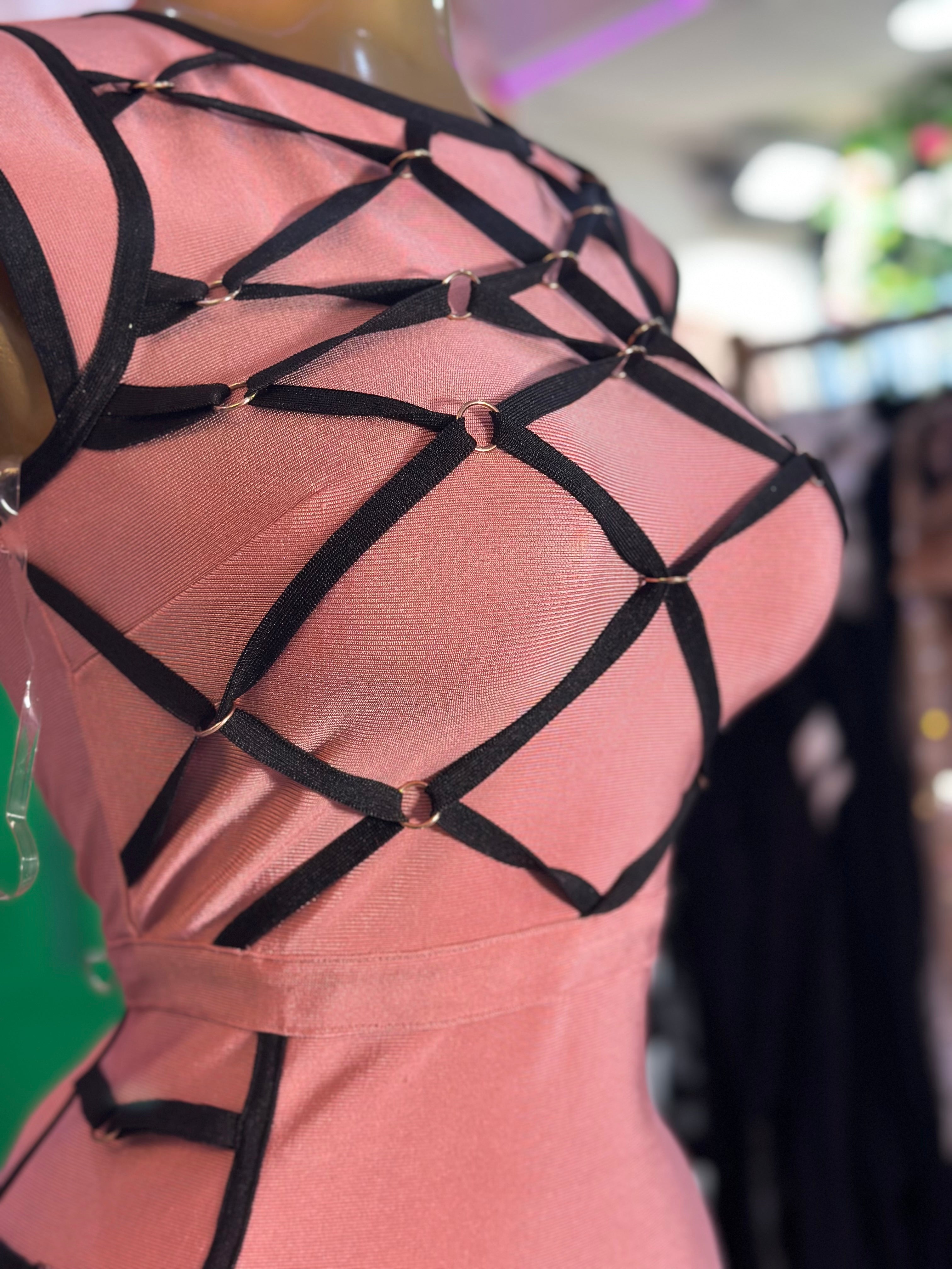 Impacta con este vestido bandage rosa con tiras negras, diseñado para realzar tus curvas con firmeza y estilo. Su contraste de colores y su ajuste ceñido lo convierte en una pieza poderosa y femenina, perfecta para eventos especiales, noches de fiestas o cenas elegantes.