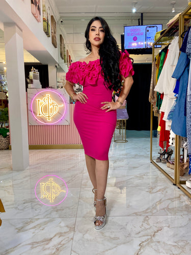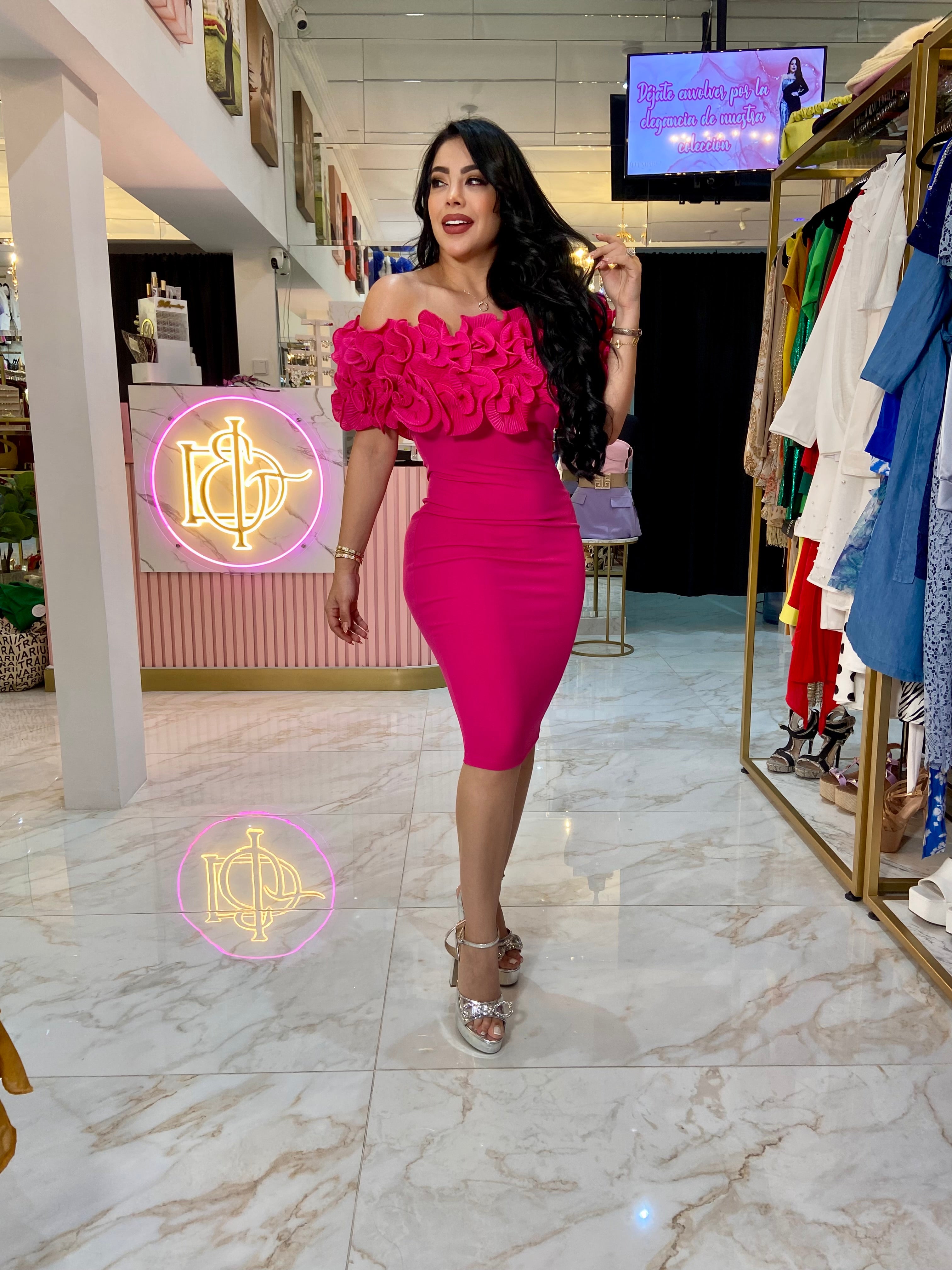 Vestido fucsia con delicados volantes en los hombros, que aportan un toque femenino y elegante. Su corte ajustado resalta la figura, haciendo de esta prenda una opción perfecta para ocasiones especiales o eventos con estilo.